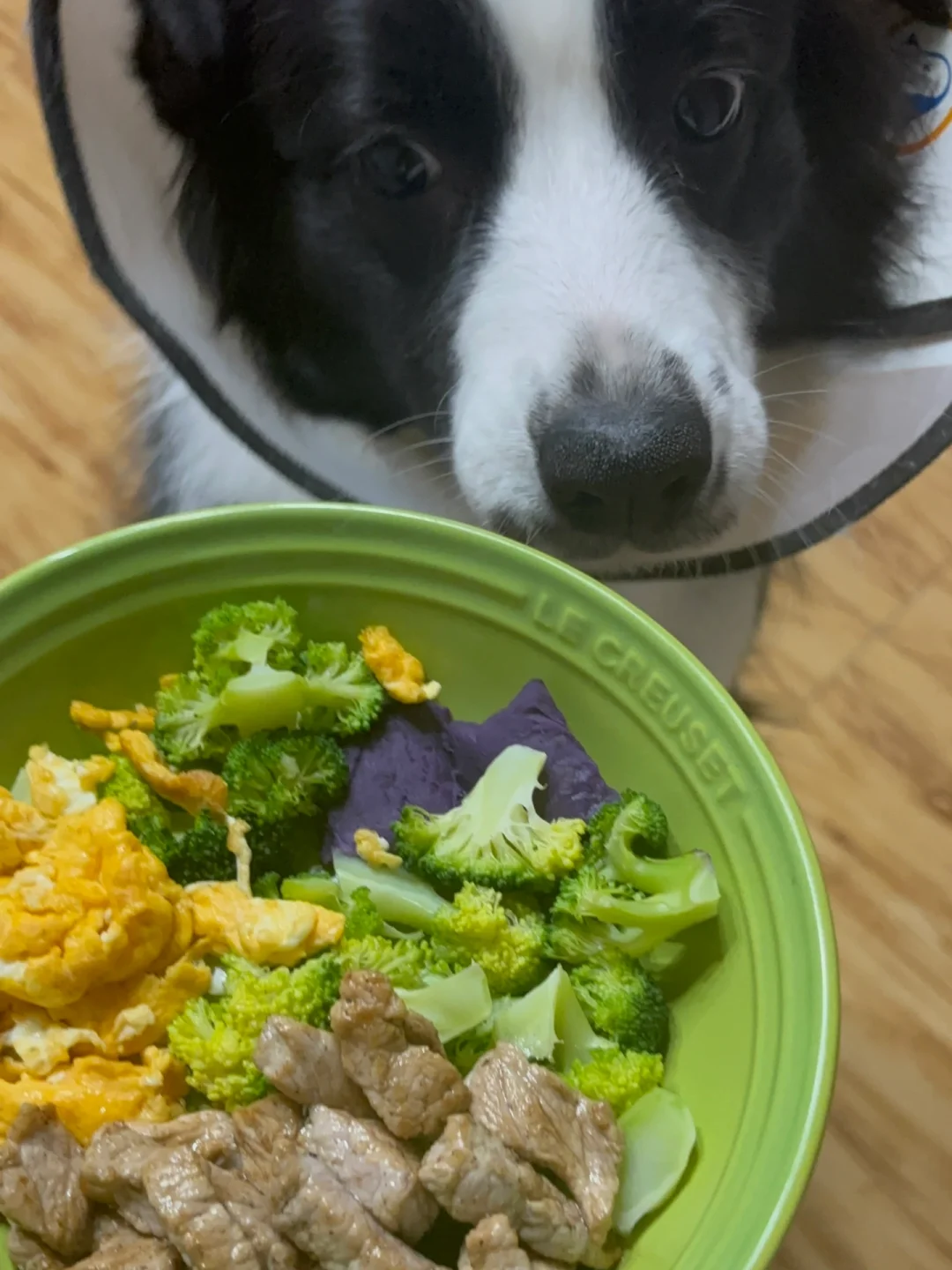 狗饭我就是当加餐喂的,所以没有特别讲究配比,就是放些肉,再搭配新鲜的西蓝花、鸡蛋、紫薯之类的,椰子也挺喜欢吃的,大家可以参考一下我的做法~