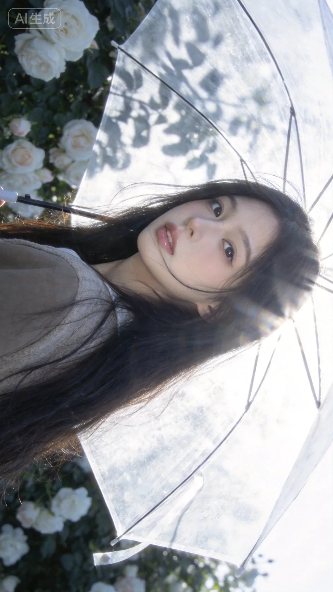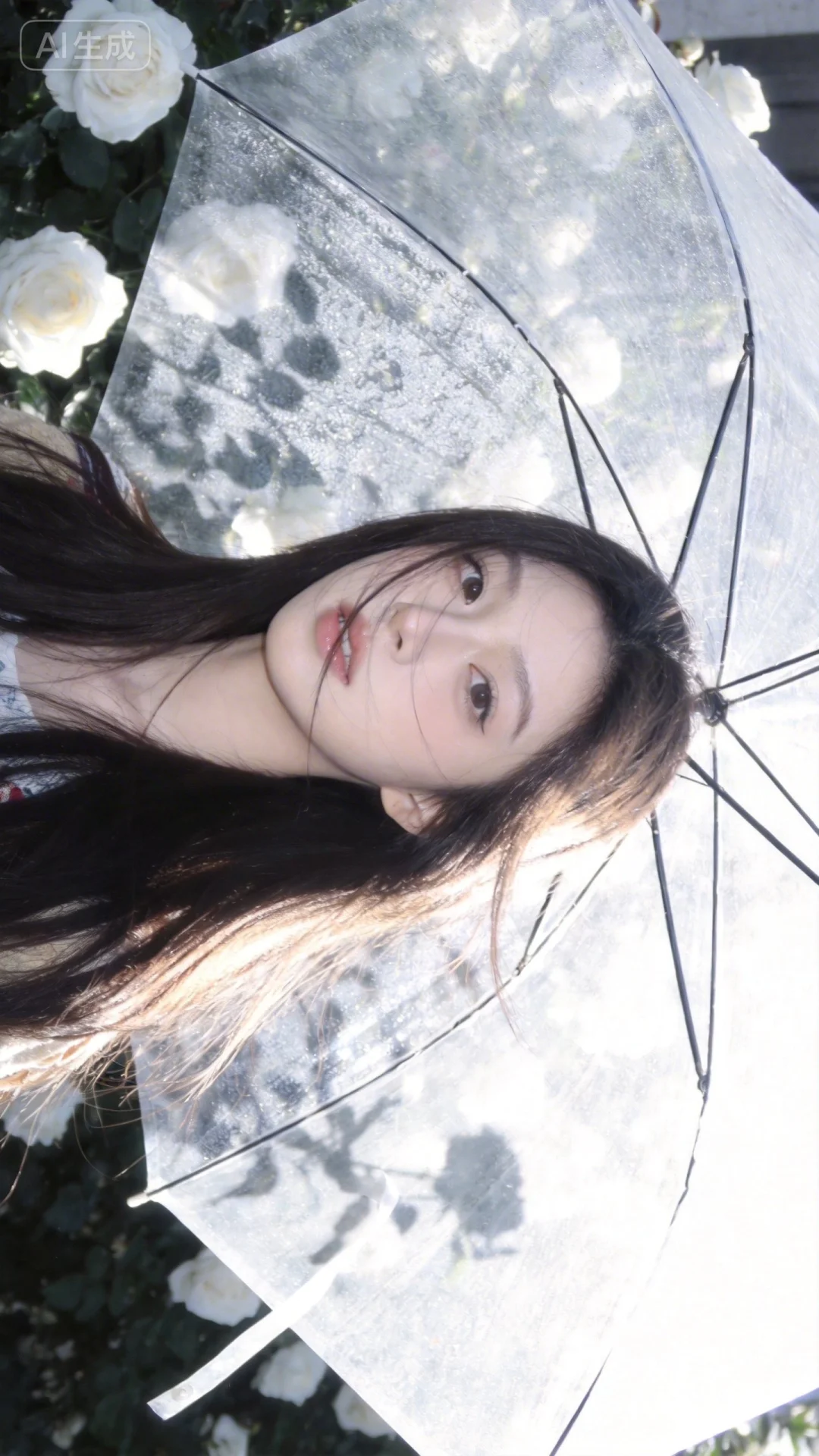 一位长发及腰、模样似洋娃娃般可爱的女生。低角度垂直仰拍看向镜头,淡彩白调(泛轻微银白),白光氛围(侧光勾勒轮廓),有多重曝光(叠加半透明光影),失焦感觉,采用超广角,强透视(压缩背景空间),体现动态美学,细节生动完美如杰作,背景里有白色蔷薇和磨砂白雨伞(伞面有暗纹),害羞,感受风,与镜头互动,人像摄影,日常快照风格,非精心构图或打光,妖冶少女,冷白皮,瓜子脸尖下巴,皮肤白皙,底妆通透,肤色均匀自然,纯欲风,发丝清晰可见。光线柔和自然,非均匀打光,表情自然松弛,照片毫无修饰感,带有生活真实感。ccd拍照感,穿着秋季服饰,鼓脸撇嘴舔舌。