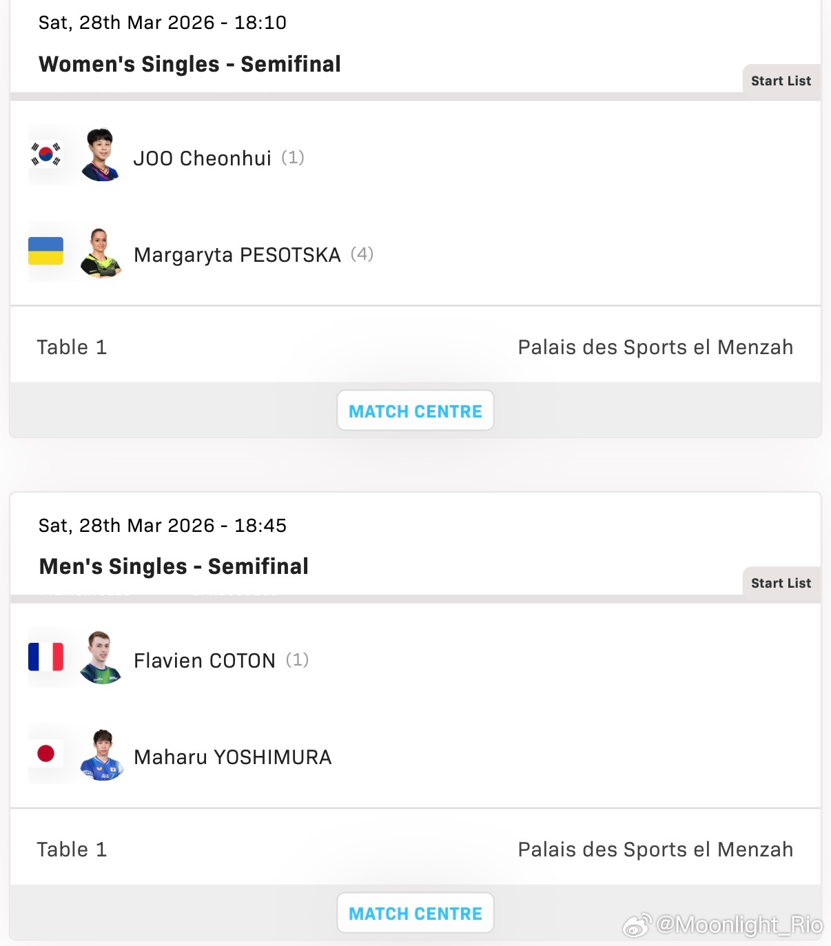 男单半决赛:🇫🇷弗拉芬·科顿🆚吉村真晴🇯🇵🇵🇹若奥·格拉尔多🆚篠塚大登🇯🇵