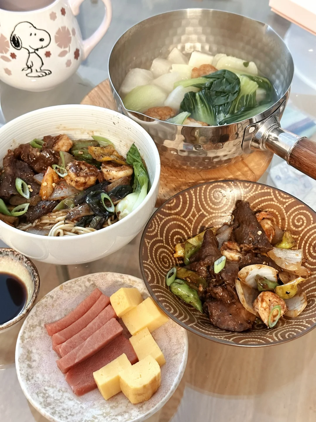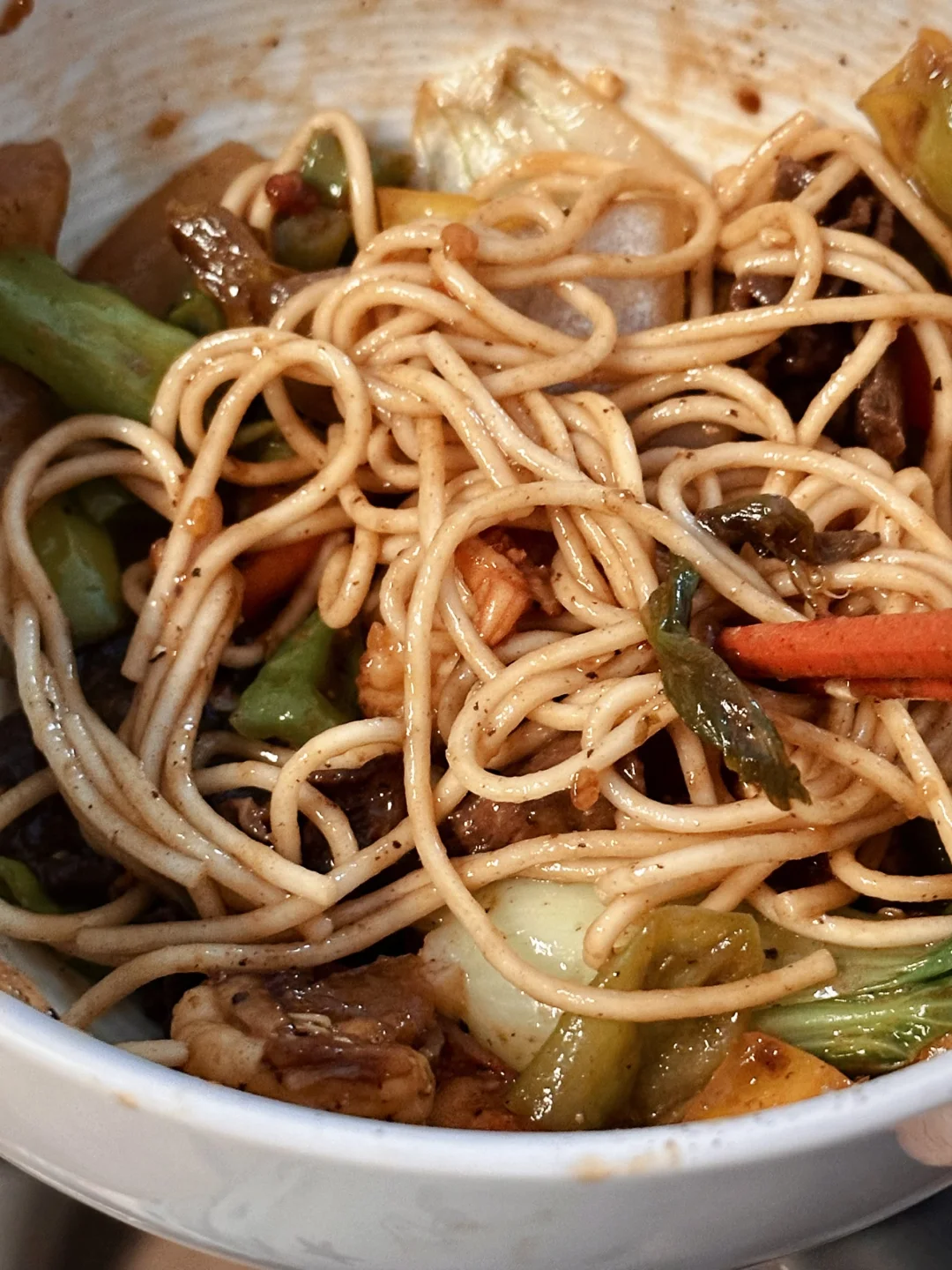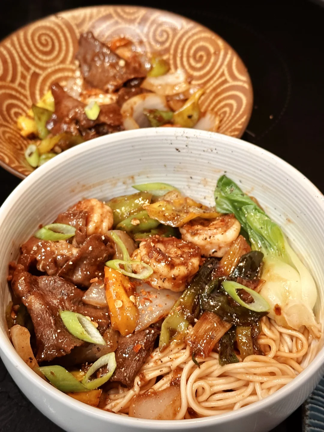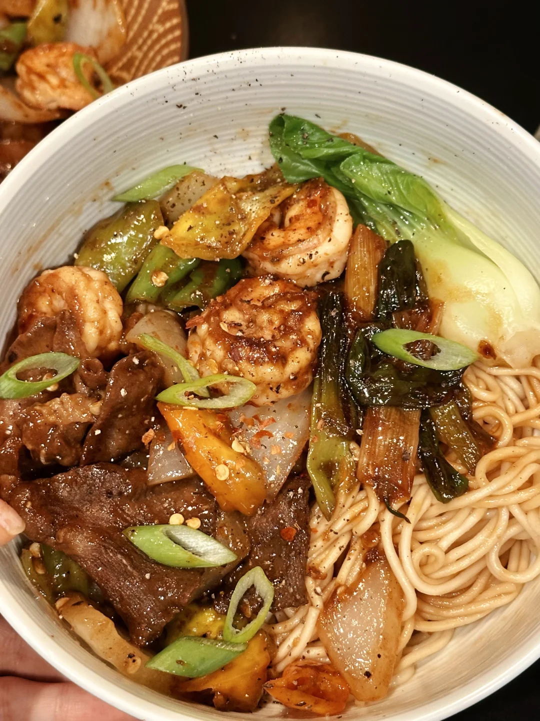 但还是招架不住现熬葱油混合着洋葱青椒虾仁炒牛肉的香味,很诚实地来到餐桌前,在尝过一口后便与我一起风卷残云。