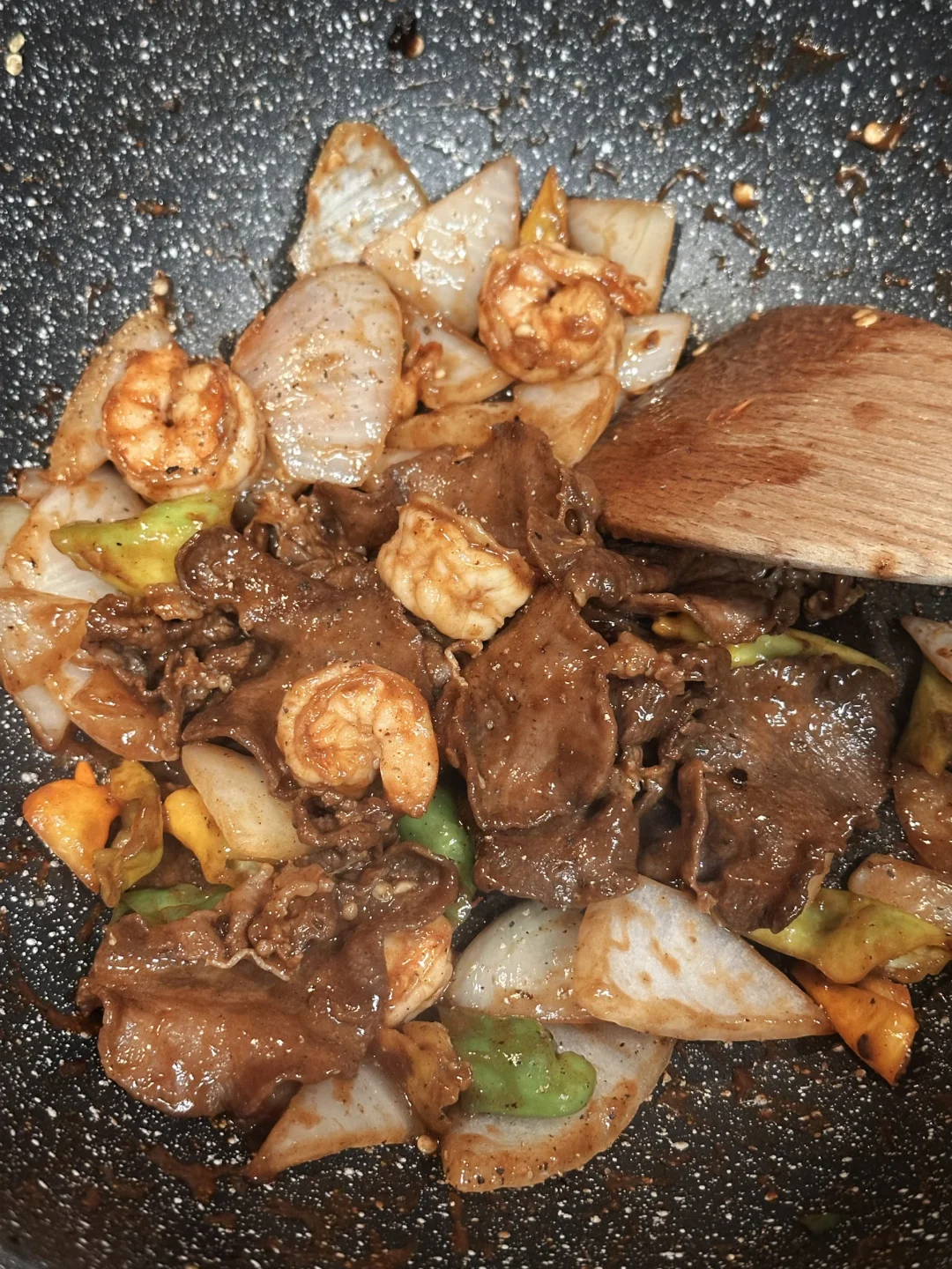 重新起锅,把洋葱和青椒爆香,放入虾仁和牛肉翻炒,加生抽,蚝油和白糖调味,稍微浅浅勾一个芡;