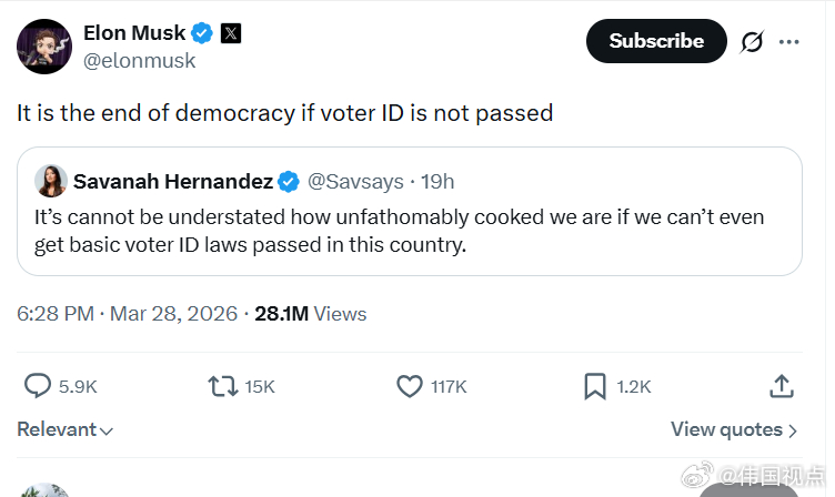 马斯克:如果不通过选民身份证法案,那就是民主的终结。