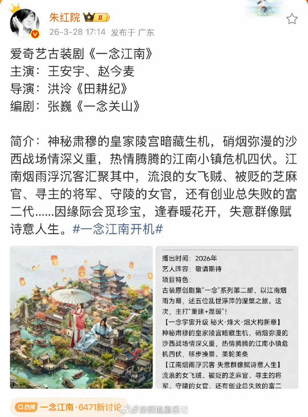 🍉《一念江南》重启!《一念江南》是定男选女吗?那王安宇和赵今麦合作,王安宇一番?这部剧之前官宣了虞书欣,当时因为舆论风波换人,后来平台补偿了《云初令》我怎么感觉得赵今麦一番?不是,那为啥执着古偶啊 一念江南