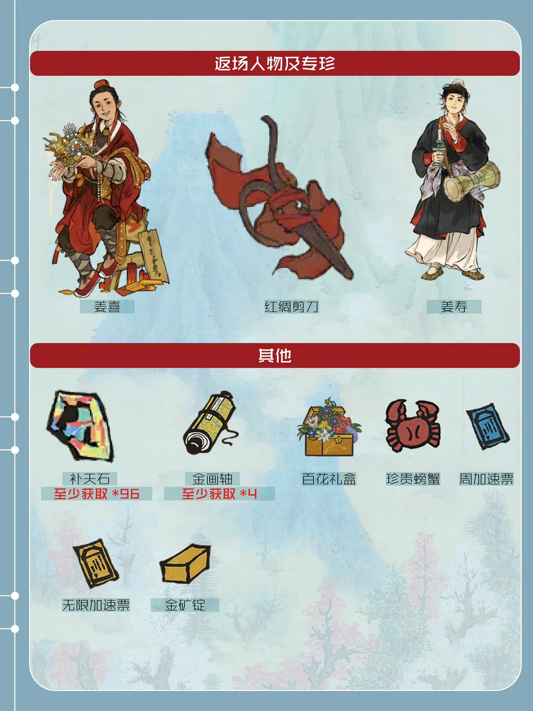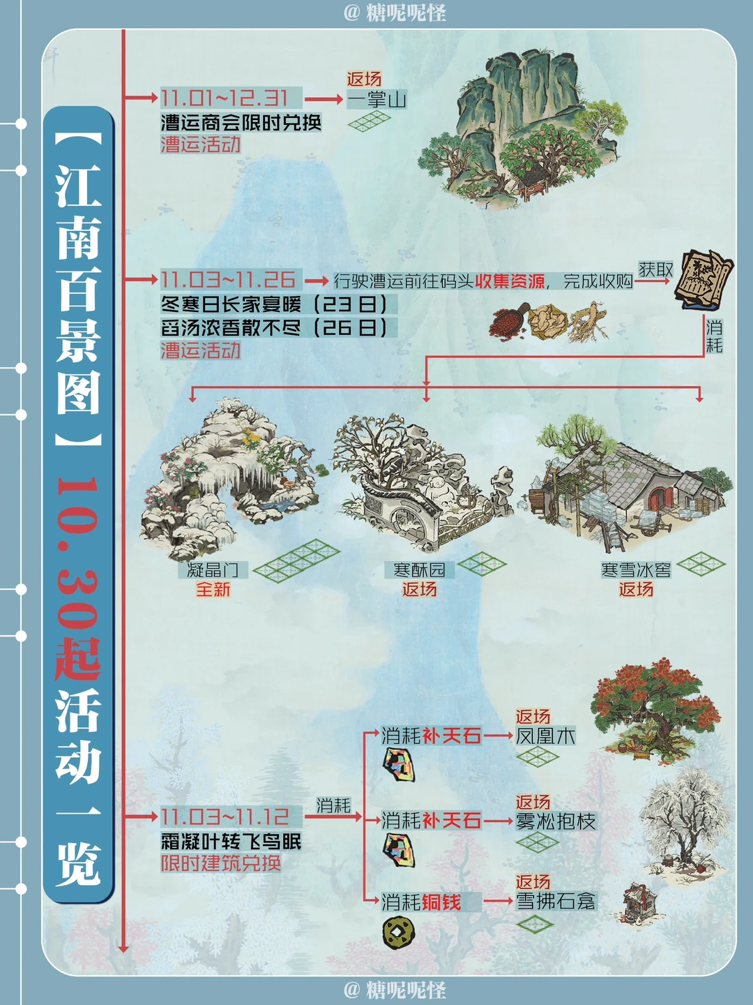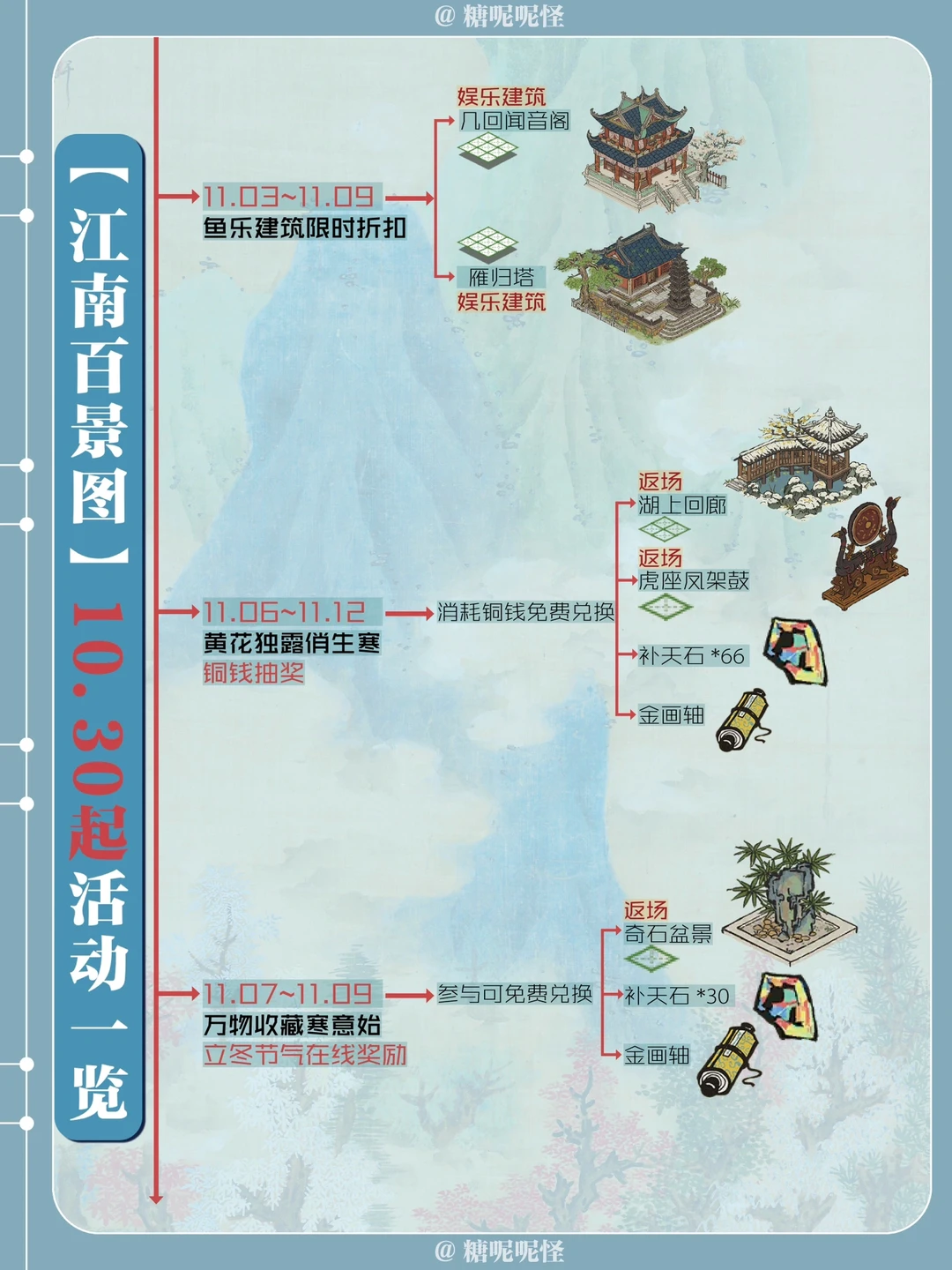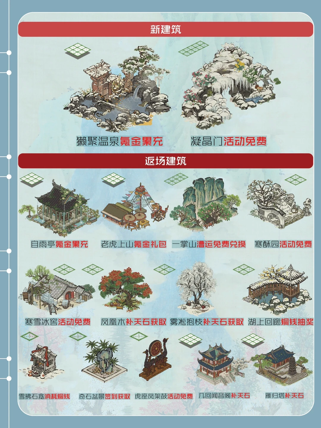 总结 新建筑: 【獭聚温泉】【凝晶门】 返场建筑: 【自雨亭】【老虎上山】【一掌山】【寒酥园】【寒雪冰窖】【凤凰木】【雾凇抱枝】【湖上回廊】【雪拂石龛】【奇石盆景】【虎座凤架鼓】 娱乐建筑折扣: 【几回闻音阁】【雁归塔】