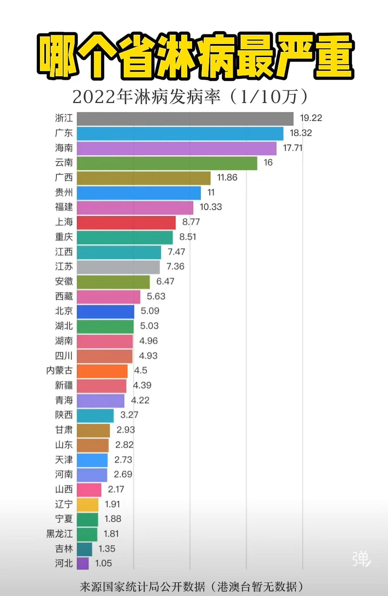 2022年淋病发病率数据揭示出明显的地域差异。浙江以19.22/10万的发病率位居榜首,广东紧随其后为18.32,海南、云南也超过16,高发病率区域主要集中在东南沿海及西南部分地区。这可能与这些地区人口流动大、社交活跃度高、检测覆盖率更高等因素相关。而河北、吉林、黑龙江等北方省份发病率普遍较低,多在2/10万以下,反映出地域间在流行病学特征上的不同。尽管浙江、广东等省发病率较高,但整体仍处于可控范围,且数据来源于国家统计局,具有较高的权威性。值得注意的是,港澳台地区未纳入统计,因此全国情况可能略有偏差。建议在高发区加强公共卫生教育、推广安全性行为,并提升性病筛查与诊疗的可及性,以实现早发现、早治疗,从而有效控制疾病传播。