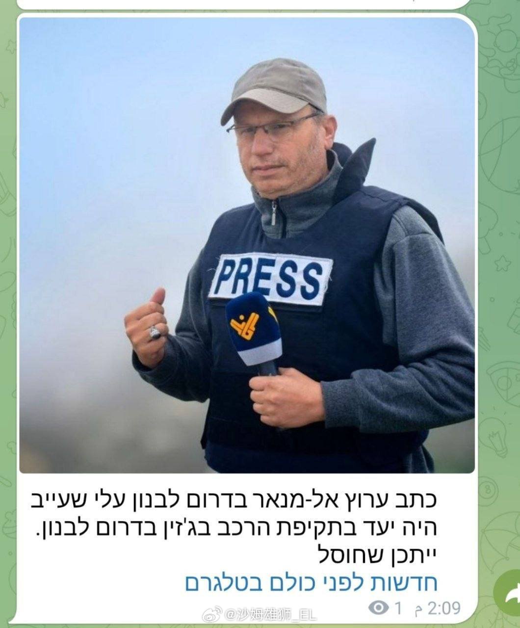 以色列空军在黎巴嫩南部袭击并杀害了两名灯塔电视台的记者阿里·舒伊布和法蒂玛·法图尼,以色列信源说是针对性暗杀。