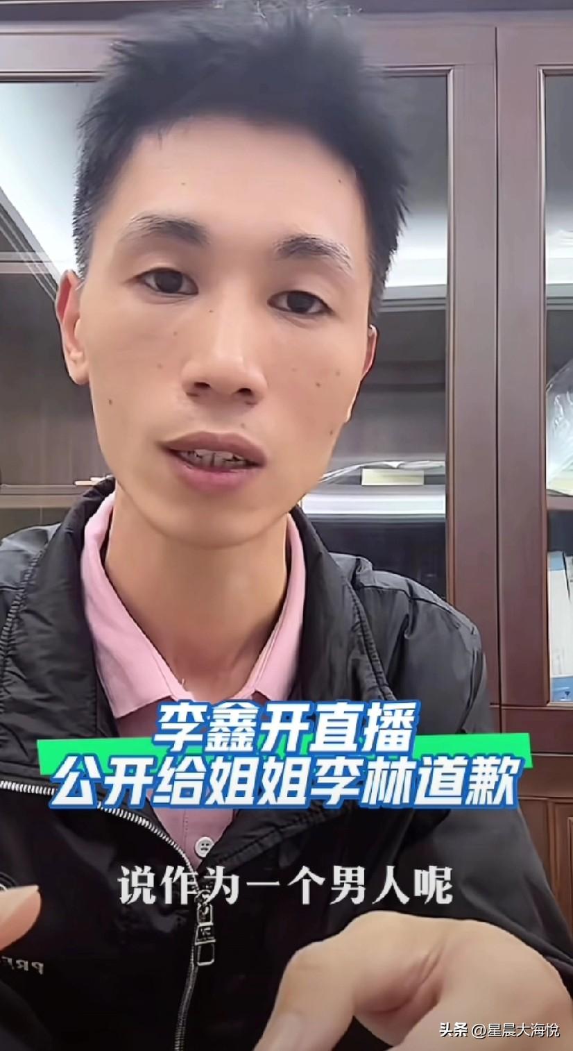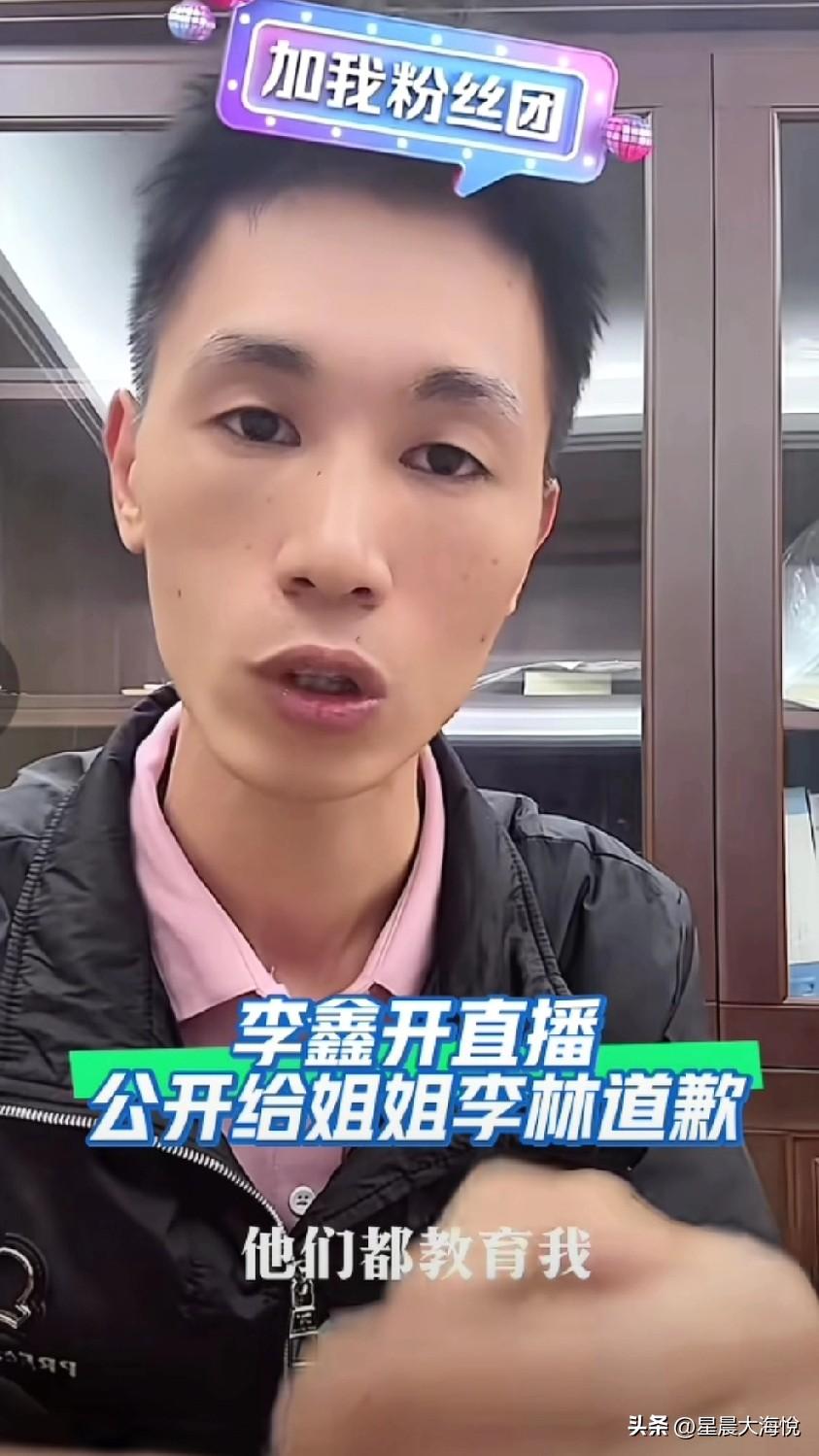 李鑫开直播公开给姐姐道歉! 他说,他回来被叔叔们教育了一顿,骂了我一顿,说作为一个男人要控制自己的情绪 最后李鑫双手合十给大家鞠躬给姐姐道歉,说对不起姐姐, 我觉得这个道歉不应该在直播间里,好像给网友们道歉似的,应该和姐姐视频通话,当面道歉应该好些,大家怎么说呢?