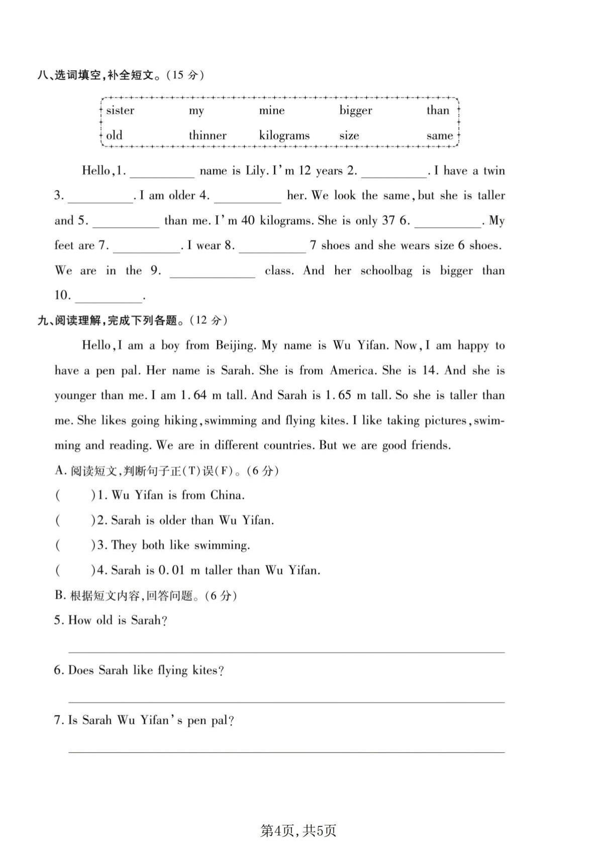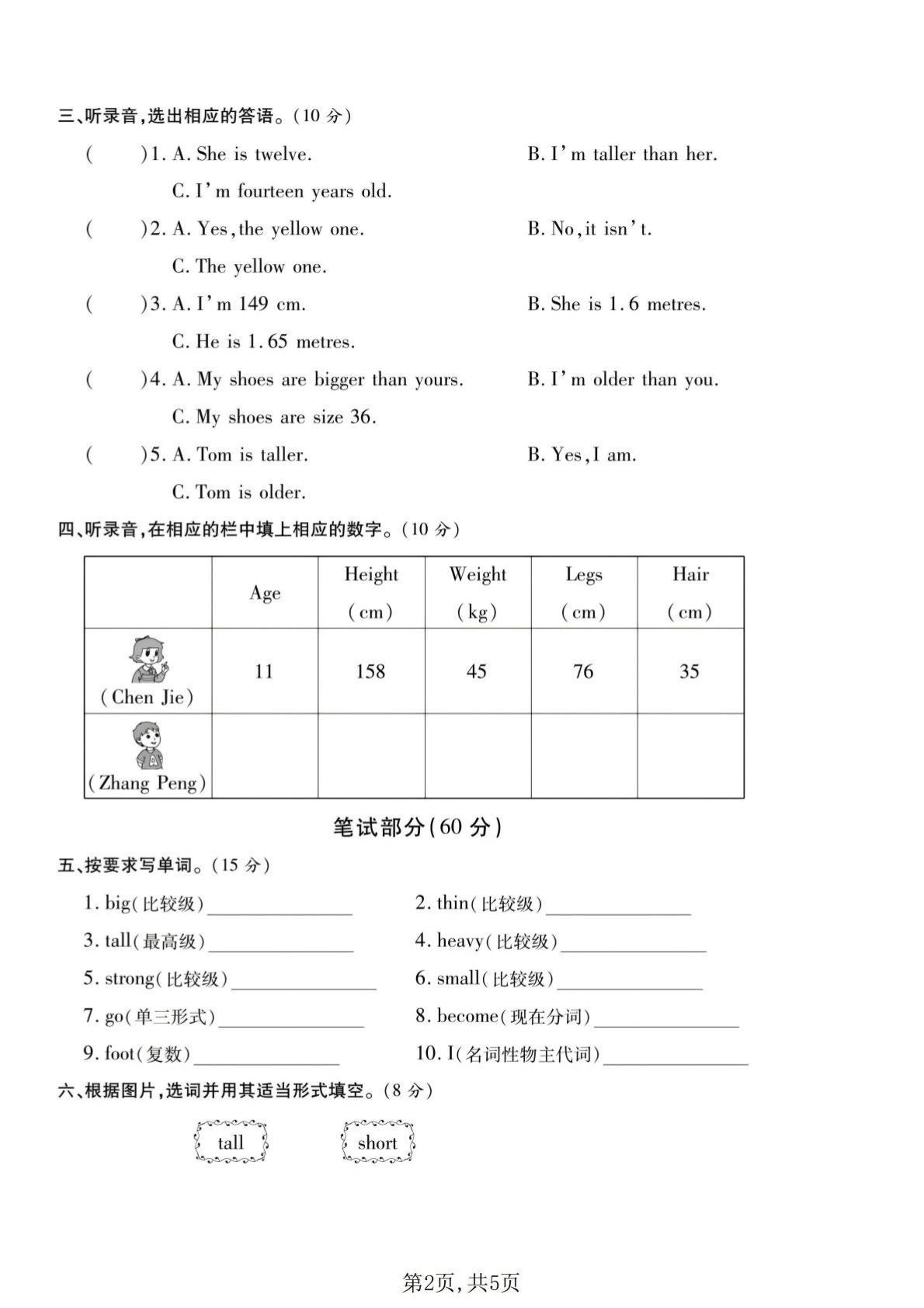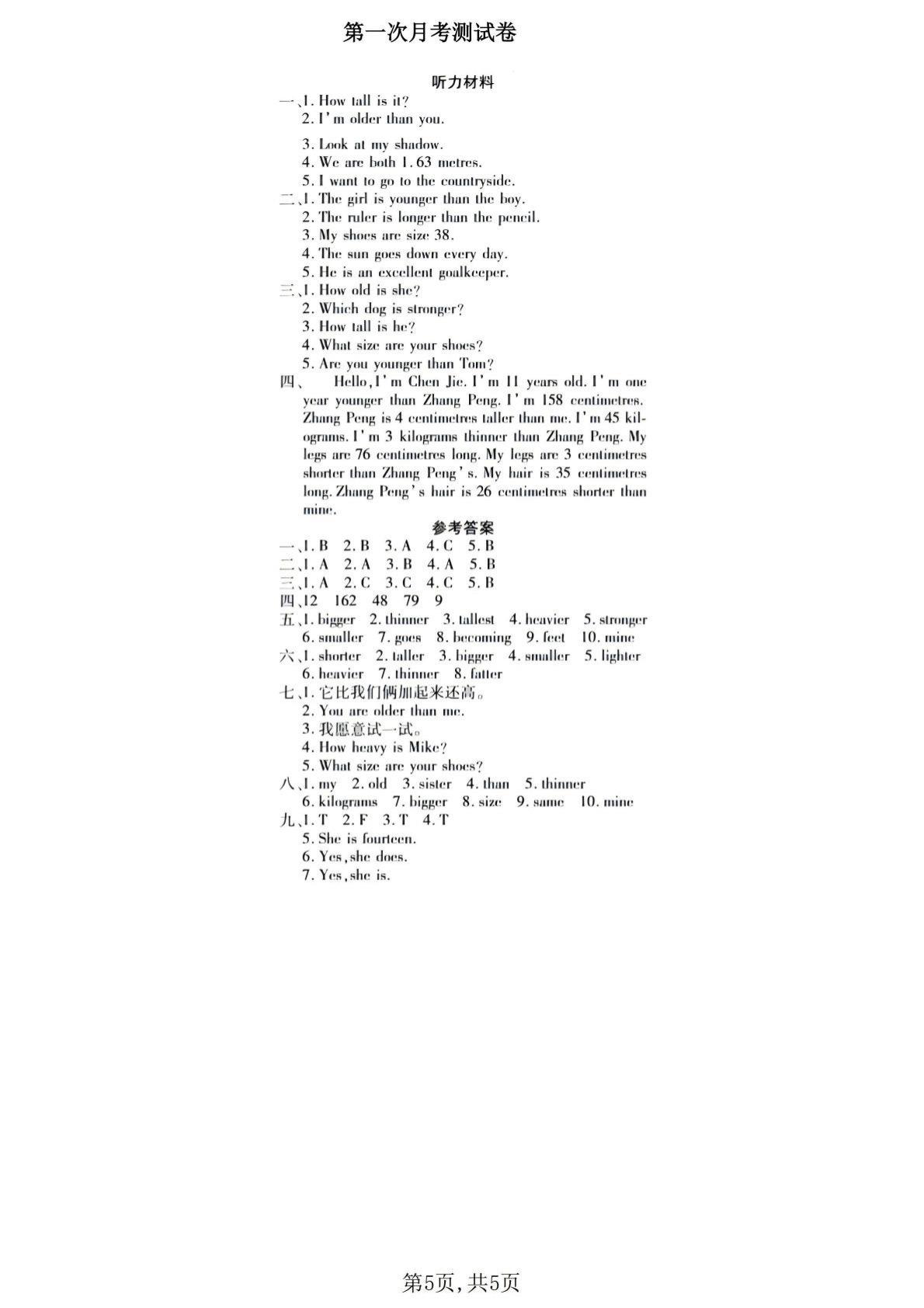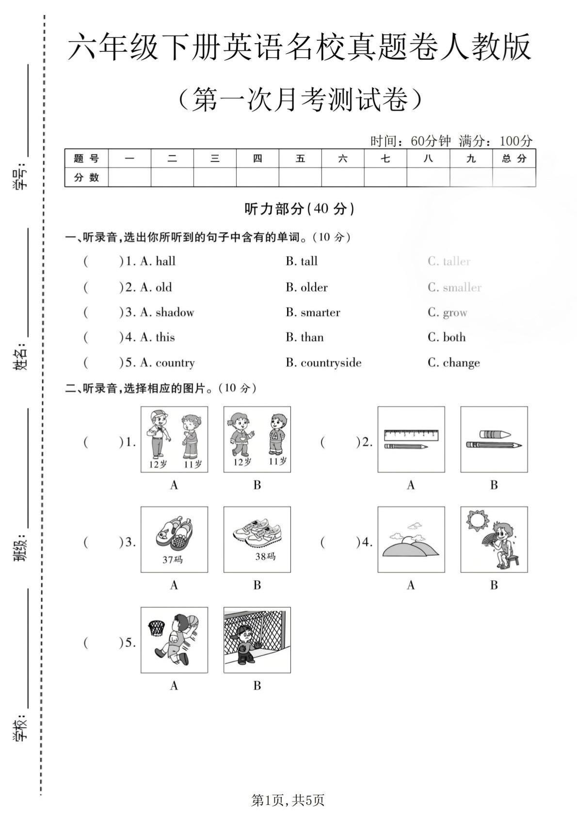 26春小学五年级下册英语人教版月考附答案。 第一次月考检测卷。