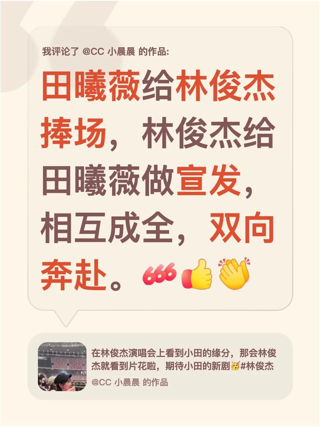 我评论了@CC小晨晨的作品:田曦薇给林俊杰捧场,林俊杰给田曦薇做宣发,相互成