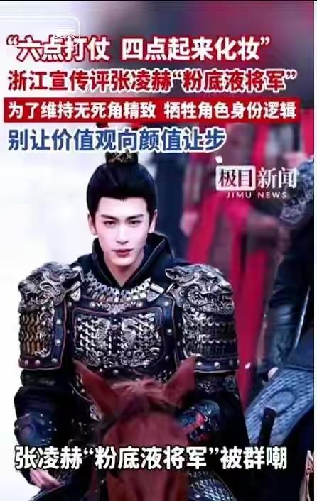 张凌赫被点名“粉底液”将军,六点打仗四点起来化妆,几公斤粉底液都敷到脸上去了! 现在的男演员和女演员有一拼,眉毛眼线口红腮红什么不用,这是让观众看你演戏还是看你脸蛋? 85后的我,实在欣赏不了近些年出道的明星,什么逐玉,与凤行,一分钟也不想看。除非有老一辈演员坐镇的,会点开看看。跟与凤行比,跟狂飙比,跟庆余年比,借用狂飙徐江的话来说:什么档次来碰瓷。。。