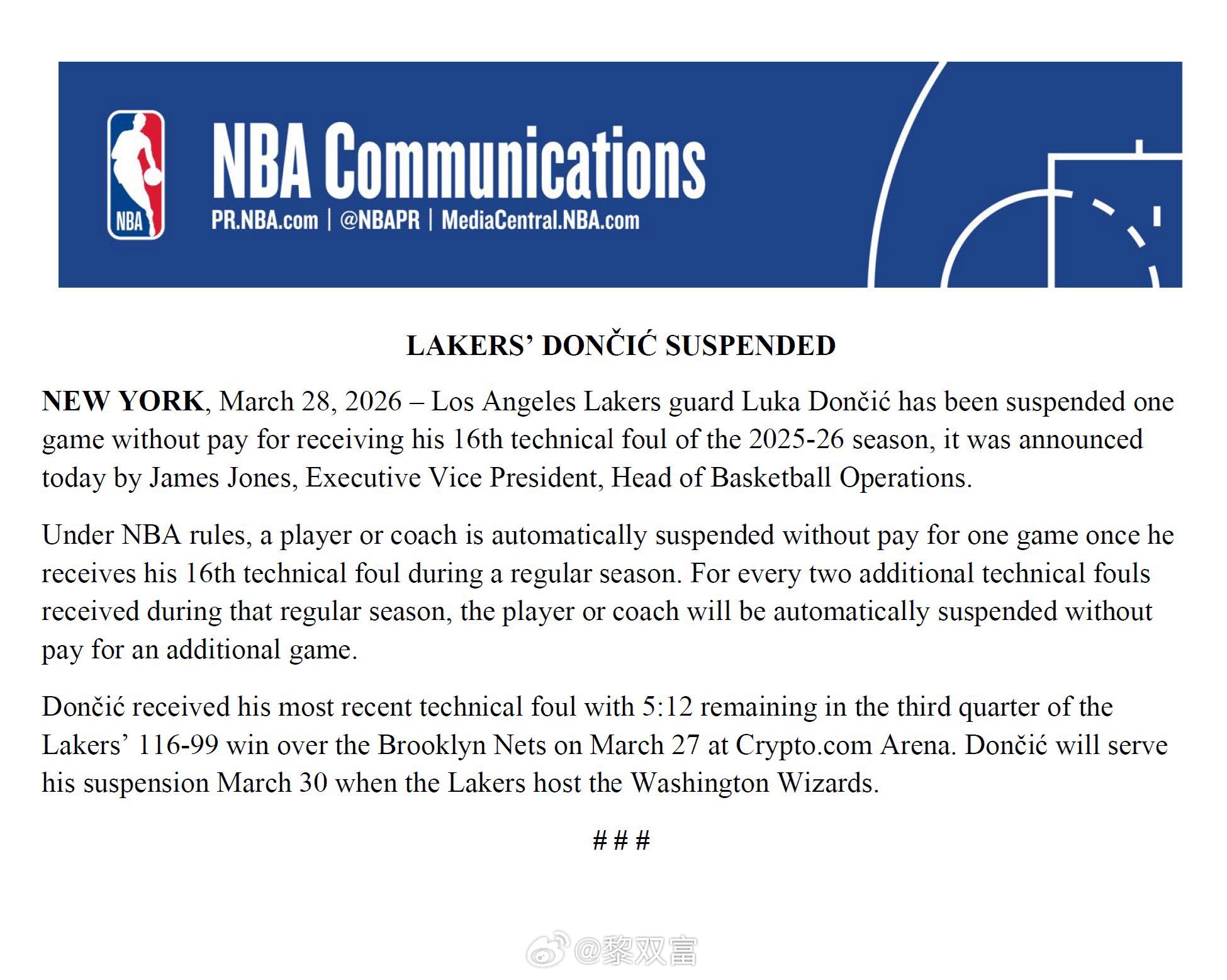 NBA宣布卢卡因技术犯规达16次自动禁赛一场,他将无法出战3月31日对奇才的比赛。与此同时,Polymarket上,卢卡拿MVP的概率继续降低,目前只有5%。