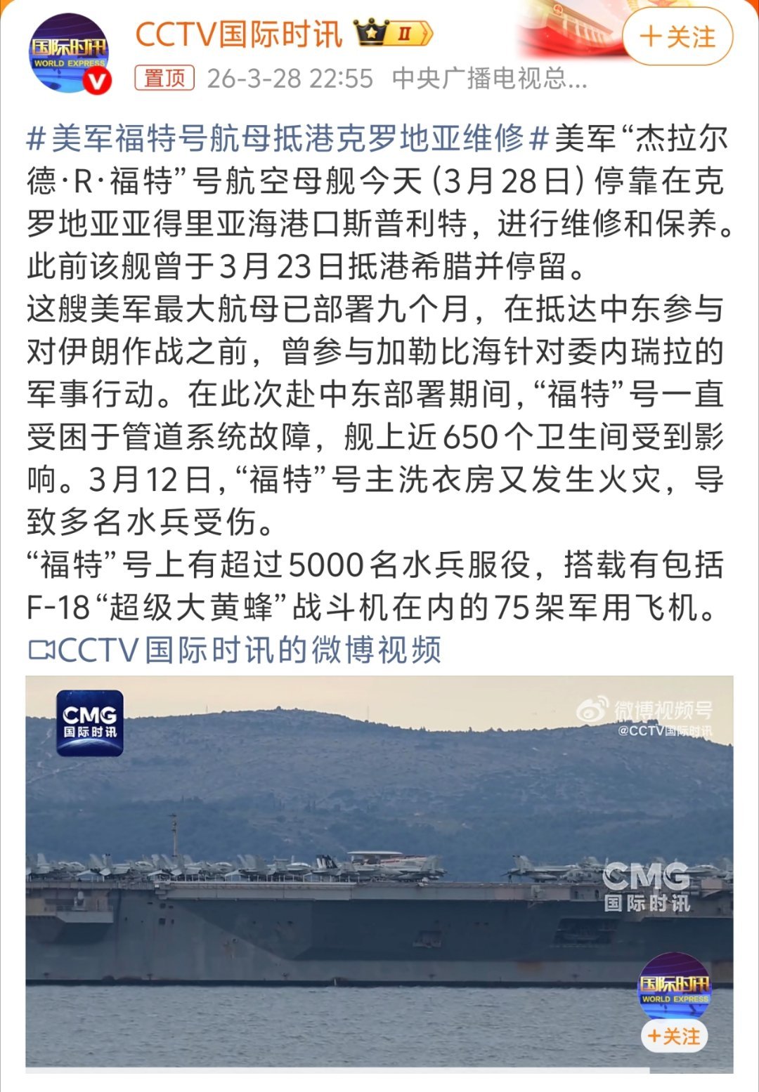 热点观点 美军福特号航母抵港克罗地亚维修