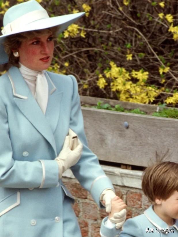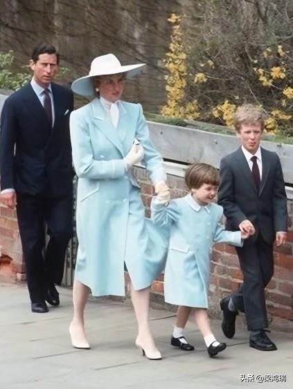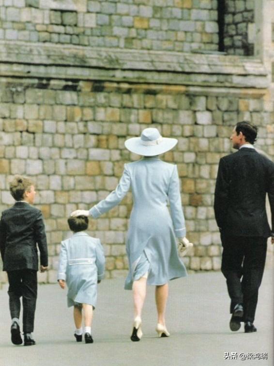 这张照片捕捉到了英国王室成员的一个温情时刻。图中是戴安娜王妃(Princess Diana)与查尔斯王子(Prince Charles),以及他们的长子威廉王子(Prince William)。 这张照片拍摄于1987年4月19日的复活节星期日,地点在温莎的圣乔治礼拜堂(St George's Chapel)外。画面中,戴安娜王妃正温柔地将手放在年仅五岁的威廉王子头上。当时他们正准备参加复活节礼拜服务。 着装风格:戴安娜王妃穿着一件浅色的长款外套,搭配一顶优雅的宽檐礼帽。这种造型被认为是她标志性的时尚风格之一。 画面中的其他成员:图中另一位年幼的孩子(左侧)被确认为彼得·菲利普斯(安妮公主的儿子)
