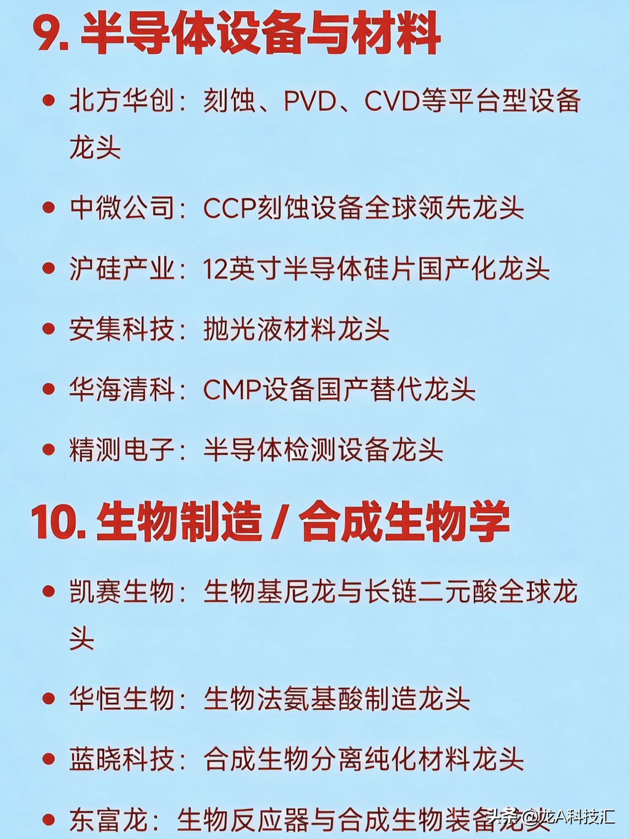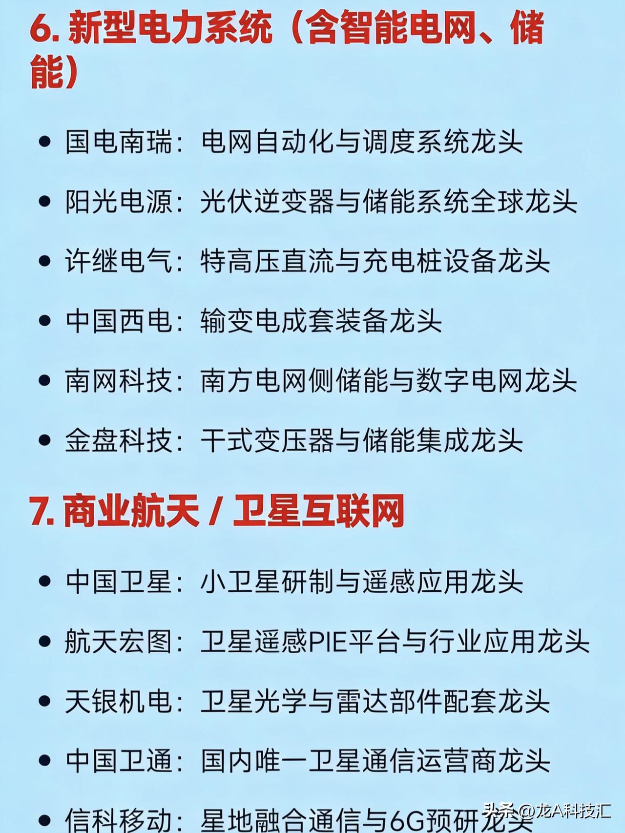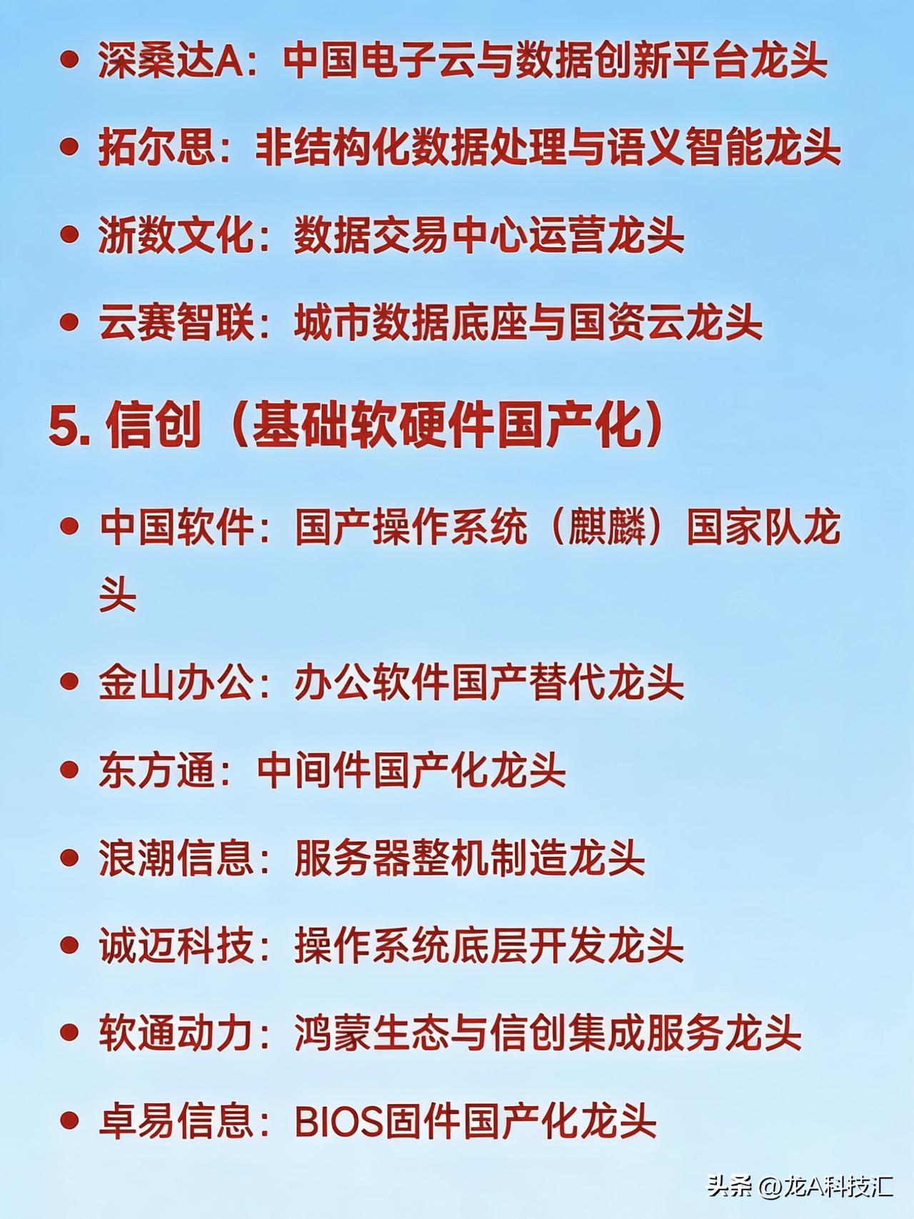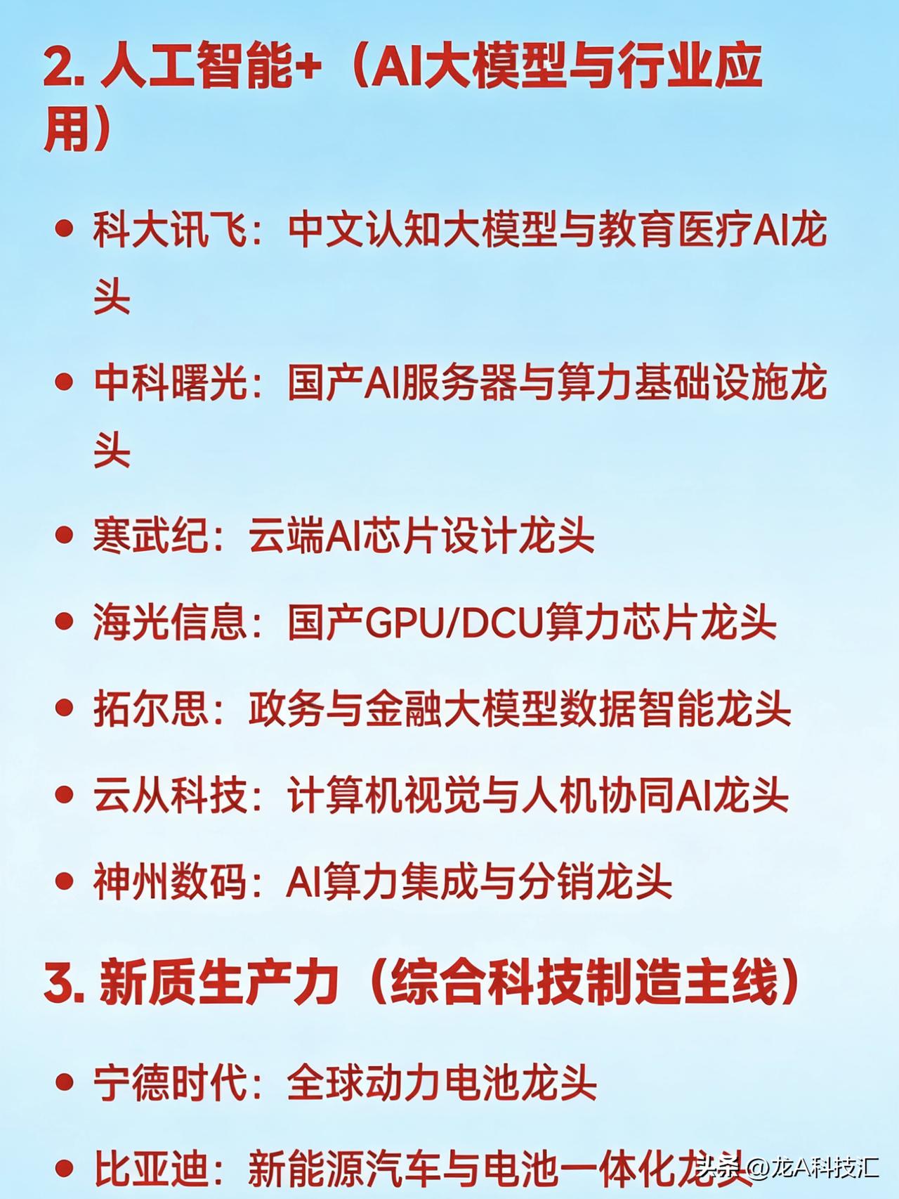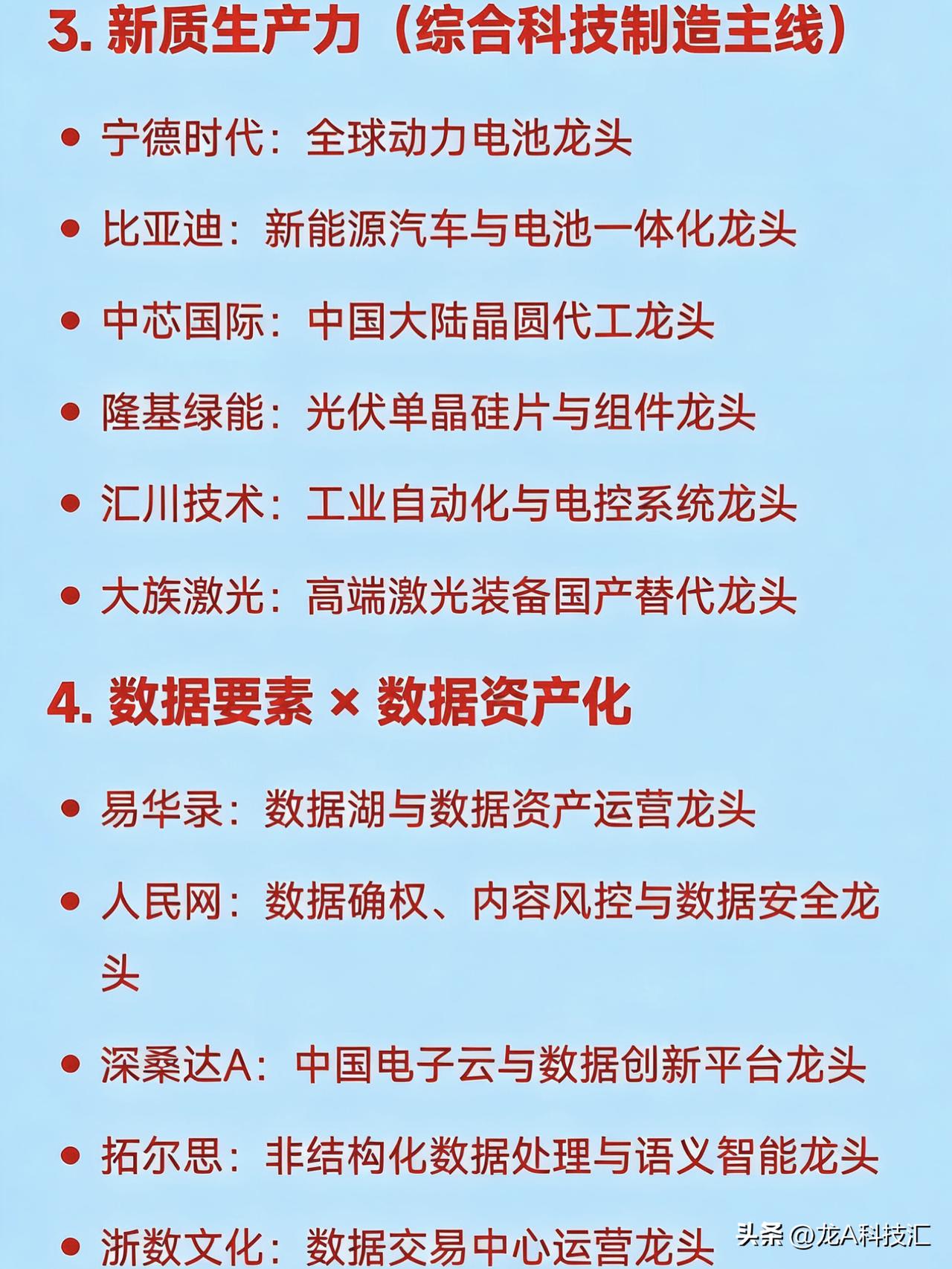 2026年,三月20大热点概念(上) 1. 低空经济 亿航智能:载人eVTOL整机研发龙头 中信海直:低空运营与通航服务龙头 万丰奥威:通用航空器结构件制造龙头 四川九洲:低空空管监视与通信系统龙头 莱斯信息:民航空管系统国家队龙头 宗申动力:航空活塞发动机配套龙头 商络电子:低空电子元器件分销龙头 2. 人工智能+(AI大模型与行业应用) 科大讯飞:中文认知大模型与教育医疗AI龙头 中科曙光:国产AI服务器与算力基础设施龙头 寒武纪:云端AI芯片设计龙头 海光信息:国产GPU/DCU算力芯片龙头 拓尔思:政务与金融大模型数据智能龙头 云从科技:计算机视觉与人机协同AI龙头 神州数码:AI算力集成与分销龙头 3. 新质生产力(综合科技制造主线) 宁德时代:全球动力电池龙头 比亚迪:新能源汽车与电池一体化龙头 中芯国际:中国大陆晶圆代工龙头 隆基绿能:光伏单晶硅片与组件龙头 汇川技术:工业自动化与电控系统龙头 大族激光:高端激光装备国产替代龙头 4. 数据要素 × 数据资产化 易华录:数据湖与数据资产运营龙头 人民网:数据确权、内容风控与数据安全龙头 深桑达A:中国电子云与数据创新平台龙头 拓尔思:非结构化数据处理与语义智能龙头 浙数文化:数据交易中心运营龙头 云赛智联:城市数据底座与国资云龙头 5. 信创(基础软硬件国产化) 中国软件:国产操作系统(麒麟)国家队龙头 金山办公:办公软件国产替代龙头 东方通:中间件国产化龙头 浪潮信息:服务器整机制造龙头 诚迈科技:操作系统底层开发龙头 软通动力:鸿蒙生态与信创集成服务龙头 卓易信息:BIOS固件国产化龙头 6. 新型电力系统(含智能电网、储能) 国电南瑞:电网自动化与调度系统龙头 阳光电源:光伏逆变器与储能系统全球龙头 许继电气:特高压直流与充电桩设备龙头 中国西电:输变电成套装备龙头 南网科技:南方电网侧储能与数字电网龙头 金盘科技:干式变压器与储能集成龙头 7. 商业航天 / 卫星互联网 中国卫星:小卫星研制与遥感应用龙头 航天宏图:卫星遥感PIE平台与行业应用龙头 天银机电:卫星光学与雷达部件配套龙头 中国卫通:国内唯一卫星通信运营商龙头 信科移动:星地融合通信与6G预研龙头 盛路通信:相控阵卫星天线龙头 8. 人形机器人 & 核心零部件 埃斯顿:国产工业与人形机器人本体龙头 拓斯达:工业自动化与机器人集成龙头 鸣志电器:空心杯电机与伺服控制龙头 江苏雷利:微型传动与电机执行器龙头 双环传动:精密减速器(RV/谐波)龙头 绿的谐波:谐波减速器国产替代龙头 9. 半导体设备与材料 北方华创:刻蚀、PVD、CVD等平台型设备龙头 中微公司:CCP刻蚀设备全球领先龙头 沪硅产业:12英寸半导体硅片国产化龙头 安集科技:抛光液材料龙头 华海清科:CMP设备国产替代龙头 精测电子:半导体检测设备龙头