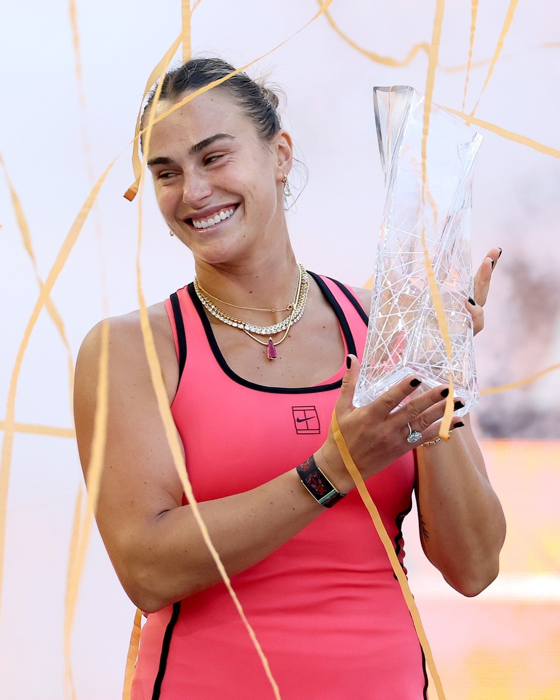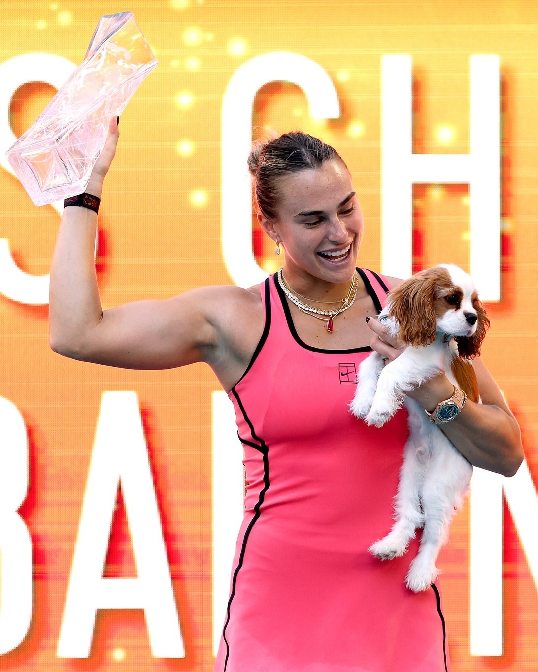 萨巴伦卡阳光双冠 萨巴伦卡Miami捧杯图!依旧有小狗🐶,依旧有彩带,阳光双冠Get!萨巴伦卡卫冕迈阿密赛冠军