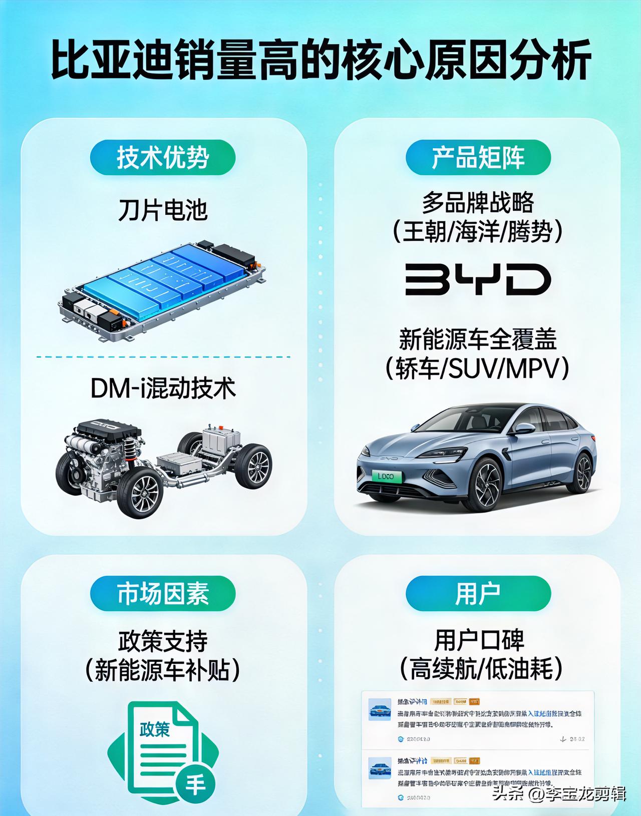 不少人随口一句“不就是便宜吗”,就否定了它所有的实力。但真正开过、用过的人都清楚,比亚迪能常年稳坐销冠,绝不是靠低价这么简单。 今天抛开所有偏见,掰开揉碎跟大家聊聊,比亚迪到底凭什么,能让这么多车主心甘情愿买单。 每次刷到比亚迪的销量数据,都忍不住感叹:这销量也太能打了!连续多月蝉联新能源销冠,纯电车型在全球市场也拥有很强竞争力,连欧洲市场都收获了大量消费者认可。很多人说“不就是便宜吗”,其实真没那么简单,今天就掰开揉碎了说,比亚迪到底凭什么这么火。 首先,比亚迪最牛的是全产业链闭环,这才是它的护城河。从上游锂矿、电池材料,到核心的刀片电池、电机、电控、车规级芯片,再到整车制造,比亚迪核心零部件自研自产率很高。别小看这一点,它意味着成本能自己说了算,供应链不受别人卡脖子,技术迭代也能更快。就拿刀片电池来说,自产率高,既保证了安全性,又能把成本控制得更合理,这是很多车企想学都学不来的。 其次,技术上是真有硬实力,不是吹出来的。 刀片电池:通过了针刺、挤压等极端测试,安全性有口皆碑,闪充表现也很亮眼,续航表现也处在行业不错的水平。 DM-i混动:这才是比亚迪的“杀手锏”,直接解决了用户的里程焦虑。市区亏电油耗表现友好,一公里花费不高,开着跟电车一样平顺,又没有续航顾虑。而且比亚迪在混动领域的专利储备充足,技术实力摆在这。 闪充技术:充电效率表现出色,很大程度缓解了很多人对电动车充电慢的顾虑。 第三,产品矩阵太全了,总能找到适合你的那一款。从亲民价位的代步车型,到中高端的家用、豪华车型,从轿车、SUV到MPV,从纯电到混动,覆盖了几乎所有细分市场和消费群体。想买代步车?有高性价比车型可选;想家用?空间、配置都能满足;想高端?也有对应的车型能兼顾体验与质感。这种“全覆盖”的能力,没几个车企能做到。 第四,太懂咱们国人的用车需求了。主流价位的车型,大屏、全景影像、智能语音、驾驶辅助、大空间、扎实的内饰用料,这些配置大多都有配备,家用出行舒适度拉满。而且保养维修成本友好,混动车型市区油耗表现不错,纯电车型日常用电成本低,长期用车很省心。 还有一个容易被忽略的点,就是用户口碑真的好。不少车主会选择复购,意味着很多比亚迪车主,会再次选择它。网约车市场占比也很高,很多司机长期行驶也少有大修情况,皮实耐用的形象深入人心。这种口口相传的信任,比任何广告都管用。 最后,比亚迪的全球化布局也在加速。海外出口表现亮眼,欧洲、东南亚、南美市场都收获不错的销量。这说明比亚迪的产品力不仅能打动国内消费者,在国际市场上也有竞争力,正在让更多人看到中国车企的实力。 其实我觉得,比亚迪的成功不是偶然,也不是靠低价,而是靠技术+成本+产品+口碑的综合实力。它用自己的方式证明了,中国车企不仅能造好车,还能造出让世界认可的好车。 你身边有比亚迪车主吗?他们都怎么评价?你觉得比亚迪最吸引你的是什么?欢迎在评论区聊聊~