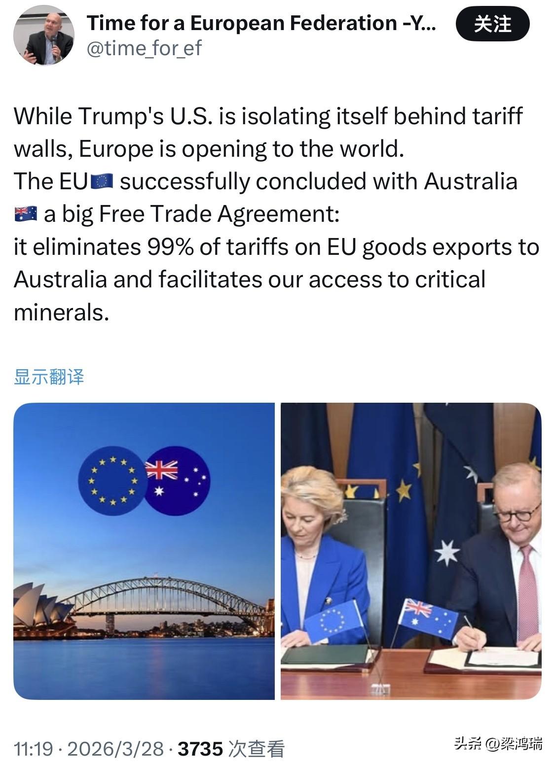 2026年3月24日,欧盟与澳大利亚在堪培拉正式敲定了这项历时八年谈判的自由贸易协定。 以下是该协定的核心要点: 1. 关税大幅削减 欧盟出口商获益:协定将取消欧盟出口至澳大利亚超过 99% 的货物关税。 具体品类:澳大利亚将取消对欧盟葡萄酒、水果、蔬菜和巧克力等产品的关税。 减免金额:预计每年可为欧盟企业减免约 10 亿欧元的关税成本。 2. 关键矿产与供应链安全 矿产资源:该协议降低了欧盟从澳大利亚进口关键矿产(如锂、钴等)的关税。 战略意图:欧盟旨在通过此举实现关键资源供应的多元化,减少对特定单一市场的依赖,并加强供应链的安全性。 3. 农产品市场准入 澳大利亚农产品:作为交换,澳大利亚的农产品也获得了更广阔的欧洲市场。例如,55% 的澳大利亚牛肉将免关税进入欧盟市场。 4. 区域战略影响 对冲外部风险:此举被视为欧盟与澳大利亚在面对美国关税政策不确定性时,寻求对冲风险的战略选择。 伙伴关系升级:双方还宣布建立新的防务伙伴关系,并启动关于澳大利亚加入欧盟科研项目“地平线欧洲”的谈判。 该协定标志着双方贸易关系的重大升级,也反映了当前全球地缘政治背景下,主要经济体寻求建立更稳定、互补的贸易网络的趋势。