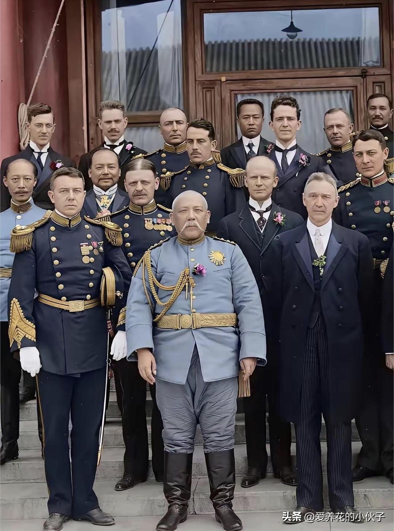 1913年,北京怀仁堂袁世凯和十一国公使罕见合影! 1913年10月10日,袁世凯就职中华民国正式大总统当天,他在怀仁堂会见十一国领事,并和他们合影留念,此时是袁世凯的高光时刻,而此时的他53岁,但胡须已经发白,但依然无法掩饰他与身俱来的霸气!