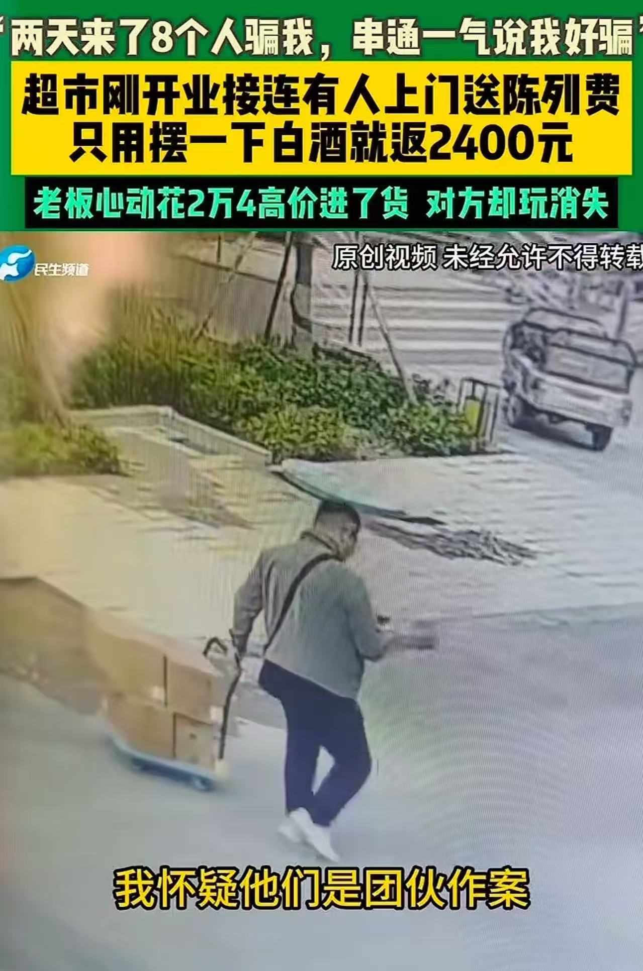 “这骗术真高明啊!”河南郑州,男子新开一家超市,有人过来说愿意支付2400元/月的陈列费,把他们的白酒铺在超市货架上卖。男子听后心动不已,这不是给自己送钱吗?可是掏了24000元进货后,再也联系不上对方,男子这才意识到上当受骗了……