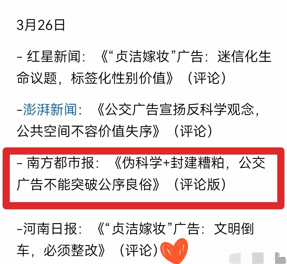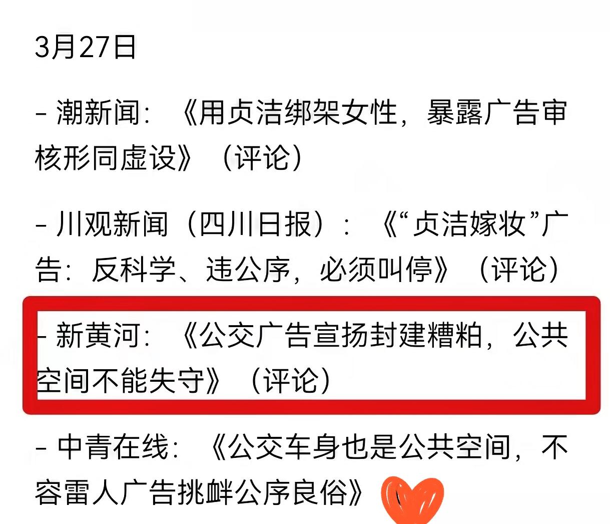 媒体触犯人民群众的底线,不能总是一删了之,必须要有人为此承担责任! 在井研县公交车广告事件中,省级官媒铺天盖地的批判该广告内容是封建糟粕,封建桎梏,是物化女性,是文明的倒退,是对女性的冒犯,它们绞尽脑汁几乎用上了五千年来所有的批判成语。 可面对一边倒的民意,这些锐评又悄悄删除,前后态度反差实在刺眼。 中华文明能绵延至今,靠的是百姓代代传承,群众对传统与文明的认知,远比脱离生活的媒体人更接地气。天价彩礼、婚前索要房车、逃避婚检等现实问题不见媒体紧盯,反倒对一句传统标语大做文章,难免让人质疑立场。 媒体脱离民意、双标评判,只会不断消耗公信力。删稿躲不掉责任,不道歉不追责,终究会被大众抛弃。只有正视民意、守住公正,才能重新赢得信任。