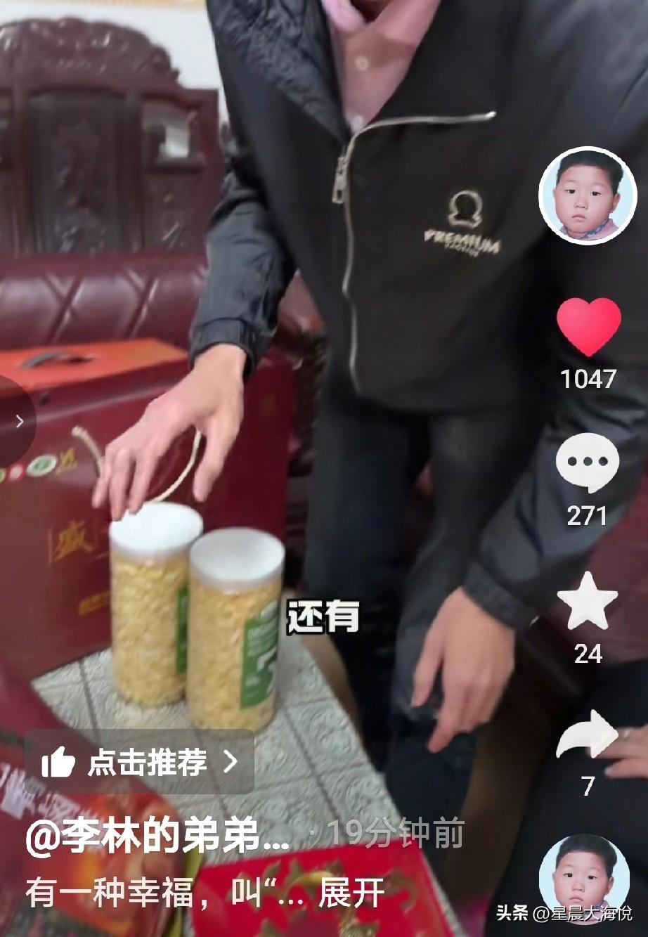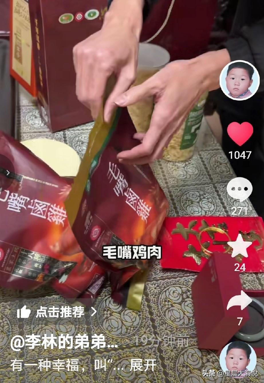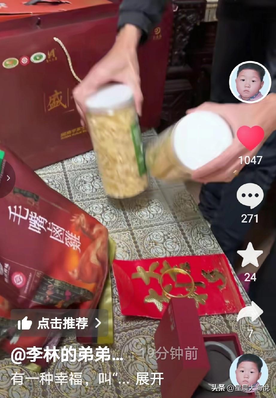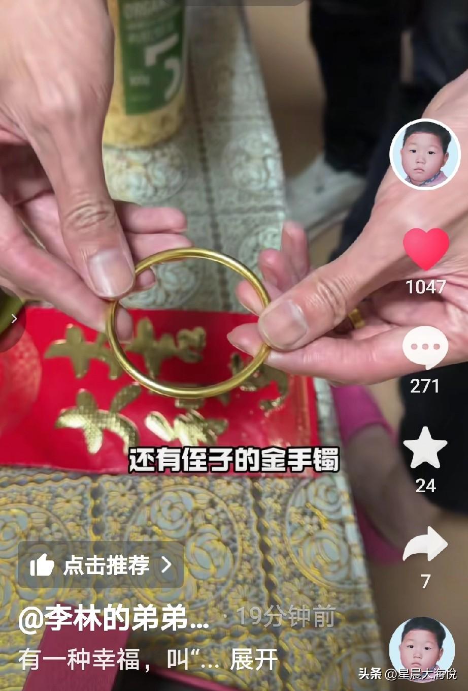 李鑫刚刚才晒出在回来时候姐姐还有那边的叔叔伯伯们给他们买的礼物 里面有:坚果,茶叶,银耳,毛嘴鸡肉, 还有给弟媳妇买的玉手镯,给侄子买的金手镯,还给了一个大大的红包,看样子红包很厚,估计得有5000不等。 最后弟媳妇在视频里说姐姐姐夫有空的话可以跟叔叔伯伯一起过来做客! 网友说,这个玉的成色非常不错,应该价格不菲,黄金现在也是最贵的时候,还给了这么大的红包,姐姐真是伟大,还花钱把房子也起好了,自己家里也有两个孩子。