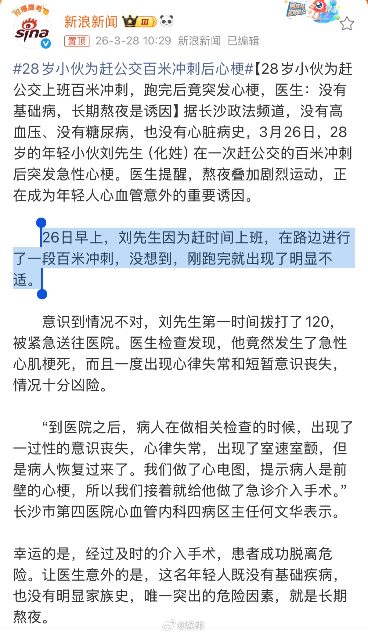 越来越多的中轻年心梗猝die本质上还是移动互联网的发展、特别是短视频的蓬勃发展,打破了各阶层的信息壁垒,让各种生活各种信息变得愈加透明,同时也让大家变得更加焦虑,再加上还有一些人专门通过大众心理贩卖焦虑谋取名利,让很多人都不再那么安分守己的过好自己每一天的生活,忘了自己的位置28岁小伙为赶公交百米冲刺后心梗