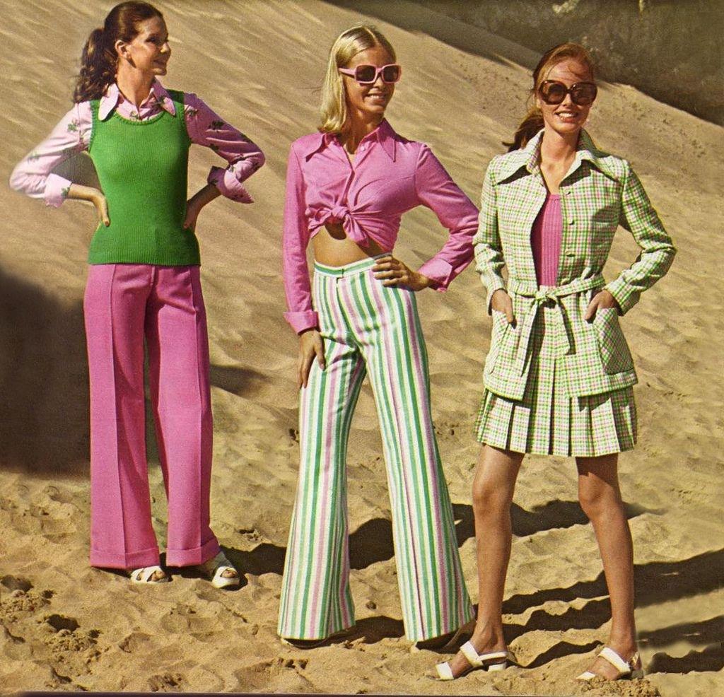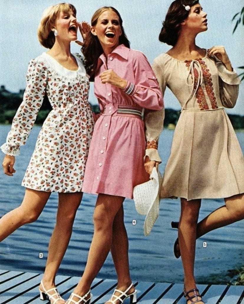 上世纪70 年代时尚延续了 60 年代的风格,起初用修身剪裁凸显女性柔美;随着潮流演变,女装版型逐渐变得宽松柔和,让女性穿搭更显优雅,也为时尚带来了全新的视觉感受;裙摆被拉长至拖地,宽松吊带裙、衬衫裙成为当时的主流爆款。 70 年代是真正敢于表达、崇尚个性的时尚时代。即便身处时局动荡的年代,人们依旧大胆追求亮眼、自由的穿搭态度。