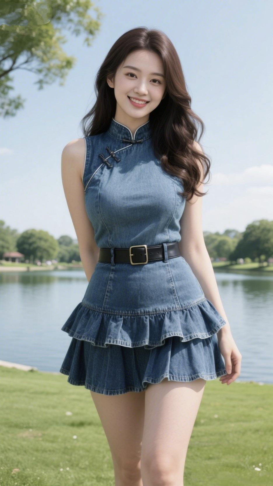 《湖畔的蓝旗袍》 风把云揉成软糖 贴在透亮的天上 你站在青草与湖水之间 牛仔布的旗袍 裹着东方的温婉 盘扣是沉默的诗 扣住半缕江南的烟 黑皮带轻轻一收 就勒住了少年的眼 层叠的裙摆 像被风吻过的浪 一摇一荡 漫过脚踝,漫过时光 长发卷着阳光的暖 笑里藏着湖水的蓝 你看向镜头的瞬间 世界都慢了半拍 原来最动人的风景 从来都不在远方 在你转身时 裙角扬起的那片晴朗 旗袍溪畔写真 旗袍烟雨景 湖畔棕裙照 旗袍绿色格子 湖畔紫裙照 湖畔绿裙照 蓝格子旗袍情 淡蓝旗袍