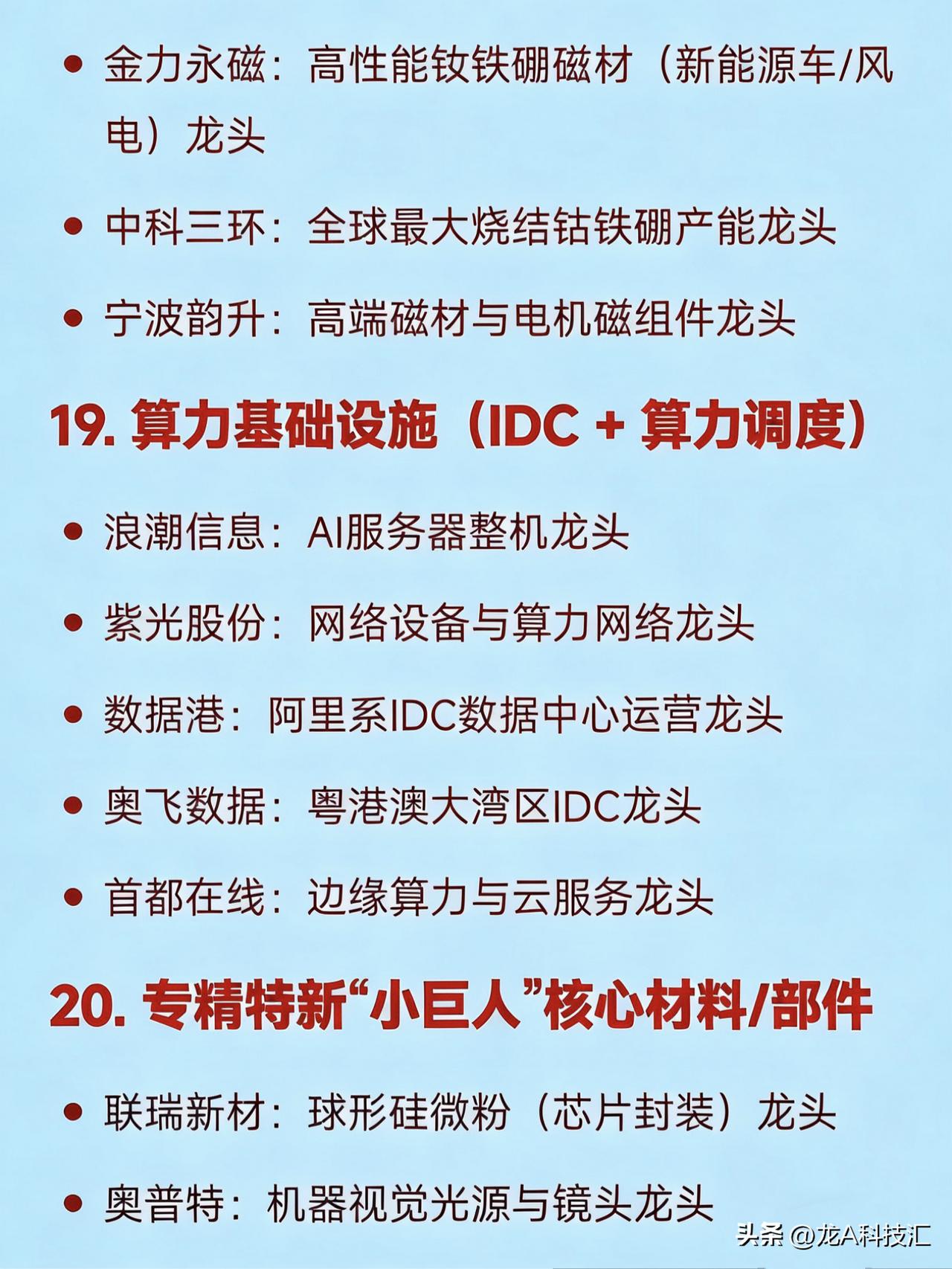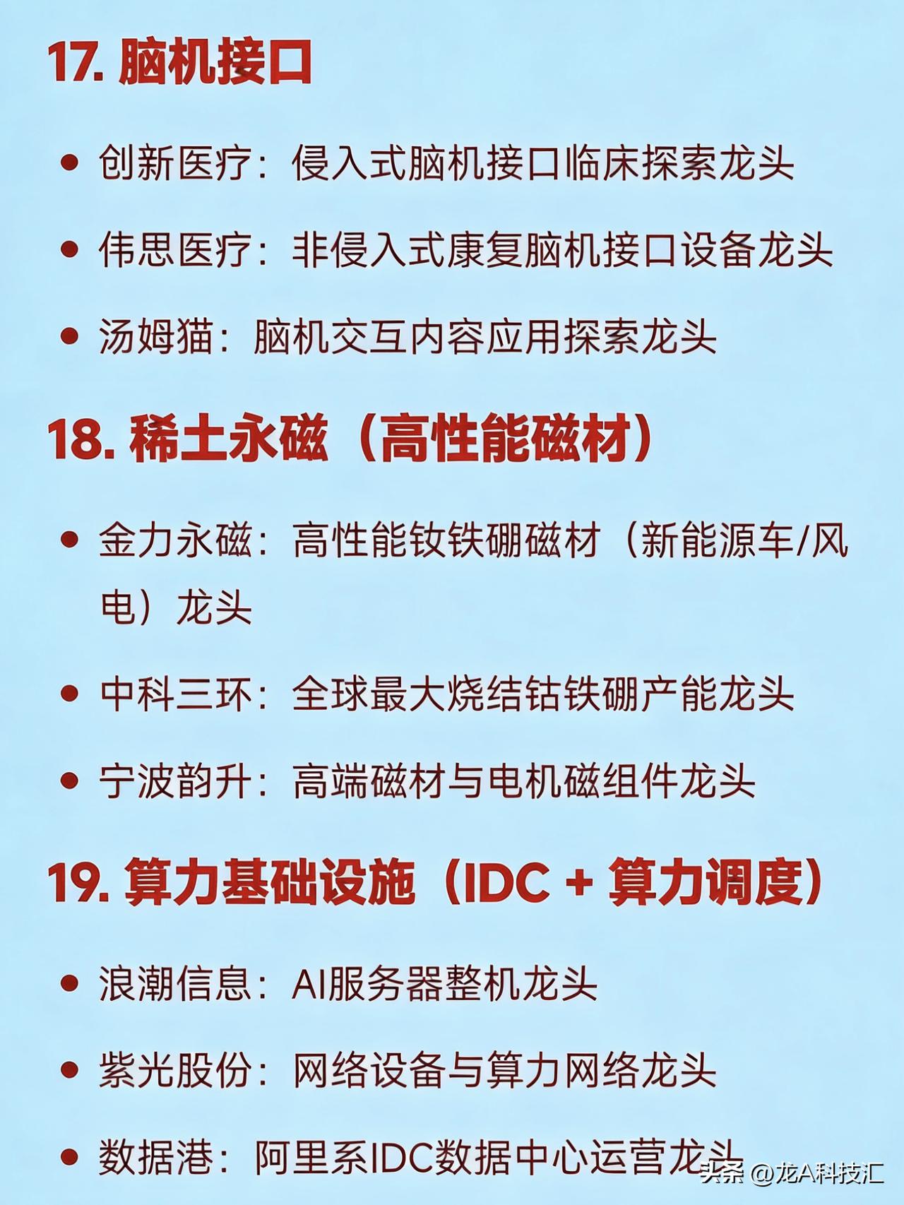 2026年,三月20大热点科技概念(下) 10. 生物制造 / 合成生物学 凯赛生物:生物基尼龙与长链二元酸全球龙头 华恒生物:生物法氨基酸制造龙头 蓝晓科技:合成生物分离纯化材料龙头 东富龙:生物反应器与合成生物装备龙头 11. 6G / 未来通信 信科移动:6G标准制定与星地融合通信龙头 中兴通讯:5G-Advanced与6G预研设备龙头 盛路通信:毫米波与卫星通信天线龙头 通宇通讯:基站天线与6G射频前端龙头 12. 可控核聚变 国光电气:核聚变微波加热与真空器件龙头 西部超导:超导磁体用Nb3Sn/NbTi材料龙头 久立特材:核聚变装置特种管道材料龙头 13. 智能网联汽车(车路云一体化) 德赛西威:智能座舱与域控制器龙头 中科创达:车载操作系统与算法平台龙头 四维图新:高精度地图与车规级芯片龙头 联友科技:车路协同平台代表 光庭信息:汽车软件与数字座舱龙头 14. 工业母机(高端数控机床) 科德数控:五轴联动数控机床整机龙头 华中数控:数控系统国产化龙头 秦川机床:精密齿轮加工与螺纹磨床龙头 创世纪:钻攻中心与通用数控机床龙头 海天精工:大型龙门加工中心龙头 15. 量子科技 国盾量子:量子密钥分发(QKD)设备龙头 光库科技:量子光源与光纤器件龙头 亨通光电:量子通信光纤网络配套龙头 16. 氢能(制储运加用) 亿华通:燃料电池系统集成龙头 美锦能源:焦炉气制氢与加氢站布局龙头 雄韬股份:氢燃料电池电堆与电池龙头 富瑞特装:液氢储运装备龙头 京城股份:高压氢瓶储运龙头 17. 脑机接口 创新医疗:侵入式脑机接口临床探索龙头 伟思医疗:非侵入式康复脑机接口设备龙头 汤姆猫:脑机交互内容应用探索龙头 18. 稀土永磁(高性能磁材) 金力永磁:高性能钕铁硼磁材(新能源车/风电)龙头 中科三环:全球最大烧结钕铁硼产能龙头 宁波韵升:高端磁材与电机磁组件龙头 19. 算力基础设施(IDC + 算力调度) 浪潮信息:AI服务器整机龙头 紫光股份:网络设备与算力网络龙头 数据港:阿里系IDC数据中心运营龙头 奥飞数据:粤港澳大湾区IDC龙头 首都在线:边缘算力与云服务龙头 20. 专精特新“小巨人”核心材料/部件 联瑞新材:球形硅微粉(芯片封装)龙头 奥普特:机器视觉光源与镜头龙头 纳微科技:色谱微球(生物医药分离)龙头 激智科技:光学膜(显示面板)国产替代龙头 芳源股份:电池回收与前驱体材料龙头