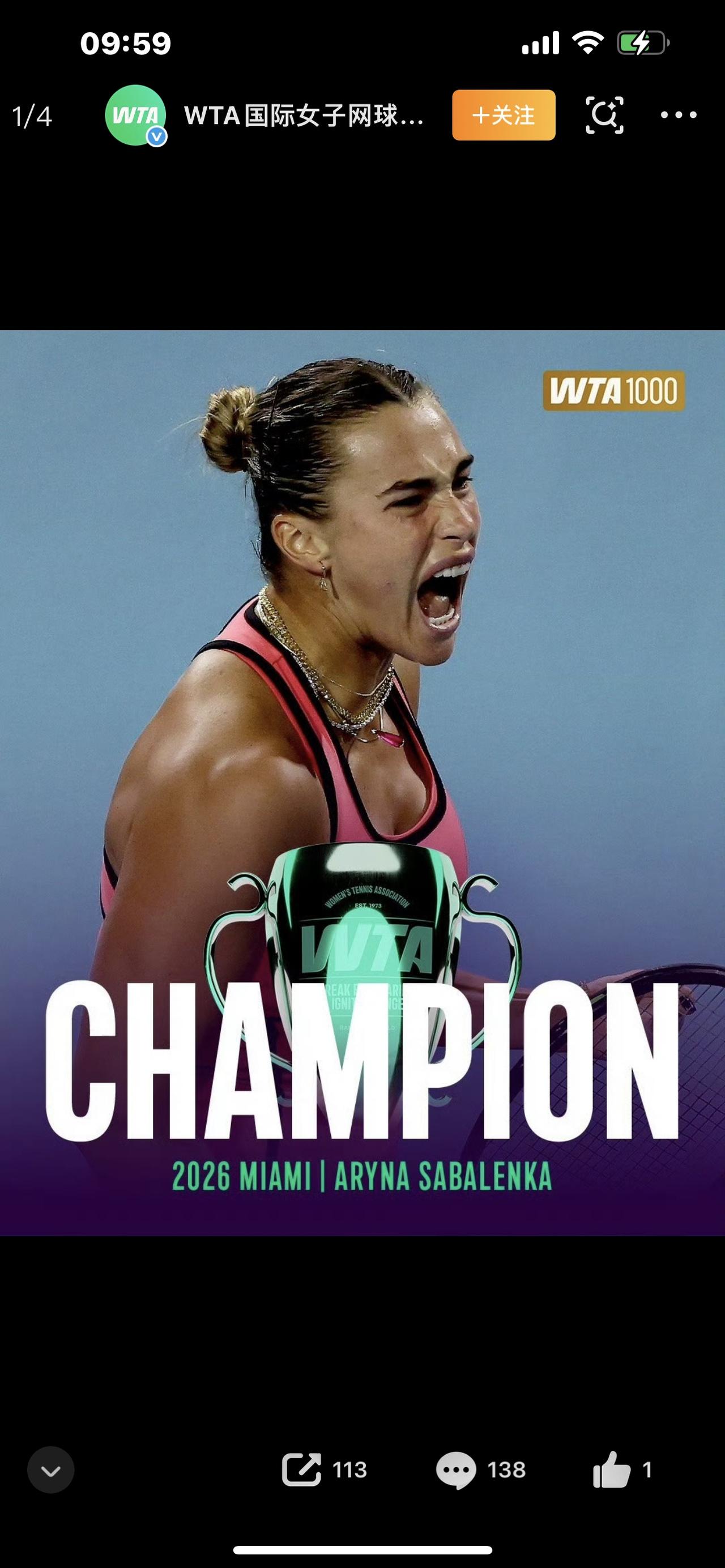 封神!萨巴伦卡卫冕迈阿密,暴力美学+12连胜,解锁阳光双冠 谁能想到?凌晨三点的网坛,直接上演热血巅峰! 世界第一萨巴伦卡,三盘鏖战2-1险胜高芙,成功卫冕迈阿密冠军,豪取12连胜,一举拿下含金量拉满的“阳光双冠”! 网友狂呼:这就是硬地女王的统治力!暴力美学+顶级韧性,直接把全网燃炸! 这场决赛,堪称教科书级的力量与意志的对决! 首盘,萨巴伦卡火力全开,势大力沉的发球+无解底线强攻,两次破发拿捏节奏,6-2速胜,仿佛在宣告“这片场地我说了算”! 谁料主场小将高芙绝不认输!第二盘疯狂调整战术,顽强防守+灵活跑动,盘末关键破发6-4扳回一城,直接把比赛拖入决胜盘! 转折来了:决胜盘,双方胶着到每一球都扣人心弦。萨巴伦卡顶住压力,开局就完成破发建立优势,尽管高芙奋力追分,但在关键第九局,萨巴伦卡再次致命破发,6-3锁定胜局! 这一刻,她握拳怒吼,释放所有压力,用实力回应所有质疑! 赛后,两人的互动更戳人!高芙真诚祝贺:“你激励我成为更好的球员”;萨巴伦卡也回敬:“我喜欢我们的竞争”,惺惺相惜的体育精神拉满! 为什么全网都在为萨巴伦卡疯狂? 因为她不仅是天赋型暴力球员,更拥有逆境翻盘的顶级韧性!本赛季23胜1负,胜率95.8%,背靠背拿下印第安维尔斯+迈阿密双冠,成为网坛历史第五位达成阳光双冠的女子球员! 她证明:真正的强者,从不是一路顺风,而是跌倒后能立刻站起来,在绝境中拿下胜利! 体育的魅力,从来不止于胜负,更在于永不言弃的拼搏! 致敬萨巴伦卡的硬核卫冕,也致敬高芙的顽强拼搏! 接下来的征程,期待她继续书写传奇,硬地女王,继续称霸!萨巴伦卡大满贯 萨巴伦卡大满贯 萨巴伦卡挑战赛 萨巴伦卡秀奖杯