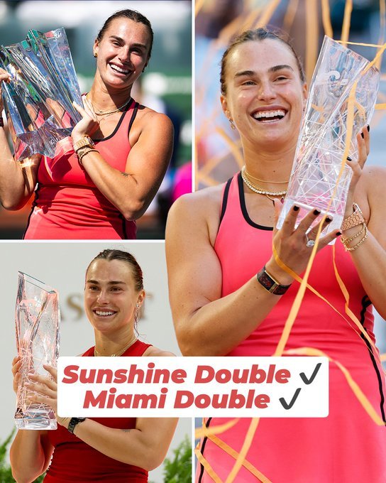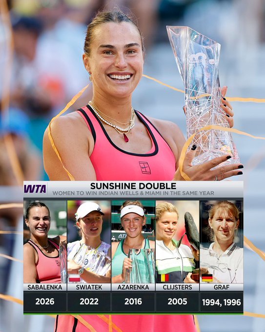 不仅完成了阳光双冠,而且也在迈阿密完成了卫冕双冠。历史上能完成阳光双冠的女球员,也只仅仅五位。萨巴伦卡阳光双冠