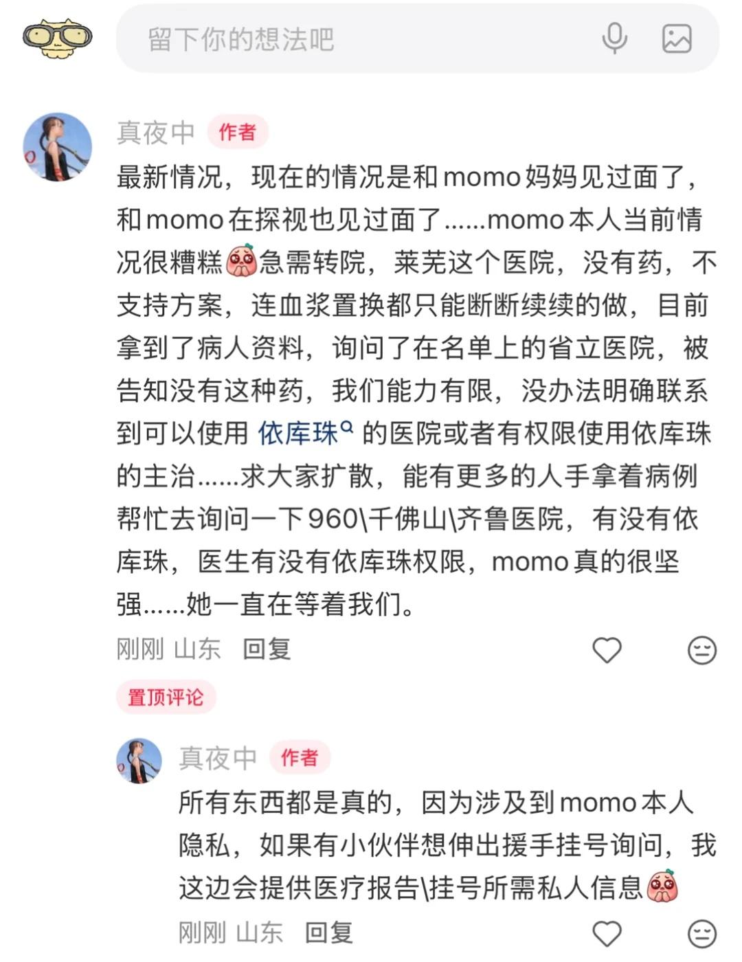 山东济南医院求助🙏🙏🙏 已经有姐妹到线下确认了事情的真实性,现在的问题是:需要医生的处方单和转院(评论区) 暖妈的状况不太好,转院风险高,ICU床位紧张,找不到可以转的医院。(P2) !!现在最主要的是转院的问题!!! 生病的暖妈在山东省济南市莱芜那边。 希望有人可以帮帮她们[完啦R][完啦R][完啦R] 原帖的链接我放在plq里!大家想要帮忙可以联系原博主,希望能扩散下让更多人知道[皱眉][皱眉] ‼️‼️最新消息 已经成功转院 不需要求助了 感谢大家的助力[赞][赞]‼️‼️ 无限暖暖 暖暖