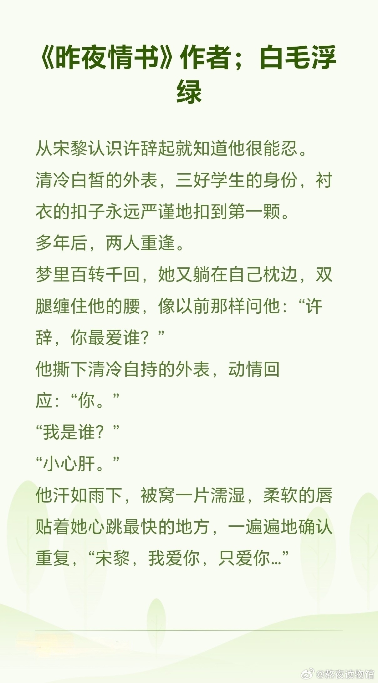 《昨夜情书》作者;白毛浮绿检查G与女明星,久别重逢男主家世很好,父母是医生,很恩爱,他原本也是要成为医生的,但是他为了守护正义,守护女主,选择了学法女主家庭情况比较复杂,爸妈都挺渣的。她因为貌美,被跟踪,被猥亵,被威胁。女主表面看起来是没心没肺,高能量,但是心里很脆弱,需要被保护男主外表看起来清冷,但是面对女主,在C上,他总是忍不住,前面交往的时候,女主经常撩拨他,但是他怕吓到女主,忍到极致重逢后,男主不再忍耐,女主也全心全意接纳他,两人像是没有分开过一样,大口吃肉女主回来,不仅是想好好和男主在一起,也想让过去欺负她的人都付出代价。过去的伤口被撕开,男主一直在守护她,帮她守护正义,然后没有任何顾虑在一起分开的那九年,女主一直在心理治疗,男主也一直在默默守护她,在女主看不见的地方,他风雨无阻的默默陪着她,治疗她的伤口。重逢后再次写情书,弥补遗憾这篇文吃的是真的很好,大开大合,但是也没感觉腻