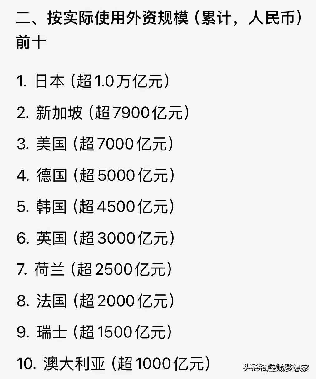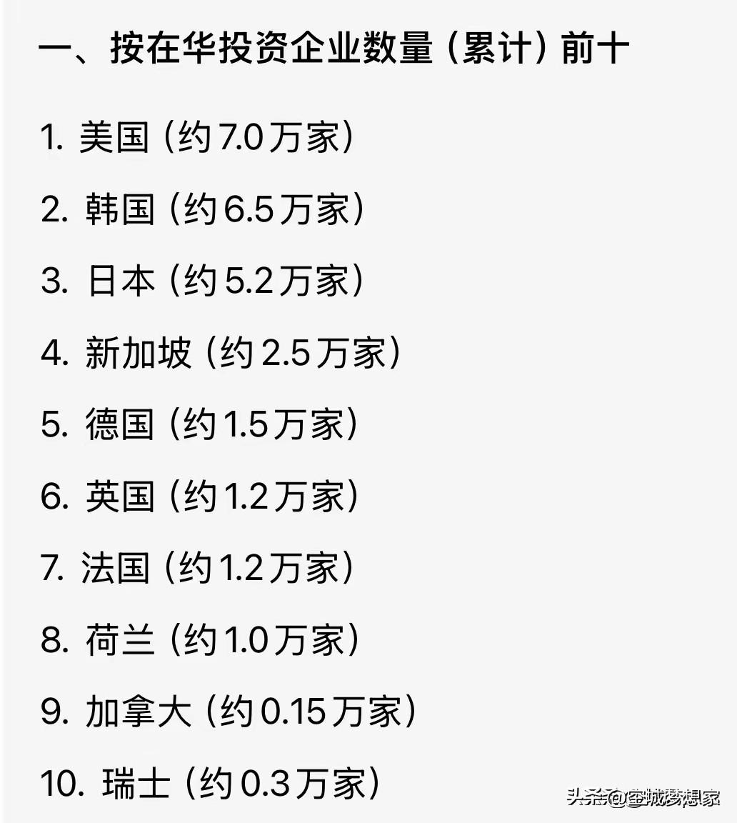 看完这组在华投资数据,彻底颠覆了我的认知 一直以为在华投资的主力是欧美国家,直到看到这三组数据,才发现自己的认知完全错了。 按在华投资企业数量算,美国以7万家高居第一,韩国6.5万紧随其后,日本5.2万排第三; 按实际使用外资规模算,日本以超1万亿人民币断层领跑,新加坡、美国分列二三位; 按雇佣人数算,日本更是以超200万的规模遥遥领先,韩国、美国紧随其后。 最让我意外的是,日本在三个榜单里都稳居前三,尤其是外资规模和就业带动上,直接断层第一。 反观我们印象里的欧洲强国,德国、法国、英国虽然都在榜单,但不管是企业数量、资金规模还是就业带动,都和日、韩、美有不小差距。 这组数据其实藏着很多信息: ✅ 日本企业深度融入中国产业链,从汽车到电子,带动了数百万就业,是实打实的经济纽带; ✅ 韩国企业数量仅次于美国,说明中韩经贸的绑定程度远超很多人的想象; 这些国家的企业扎根中国,带来的不只是资金,更是技术、就业和产业链的深度融合。为我们国家的经济发展做出了不可磨灭的贡献[赞] 在华投资 外资数据 经济观察 中日经贸 中韩经贸