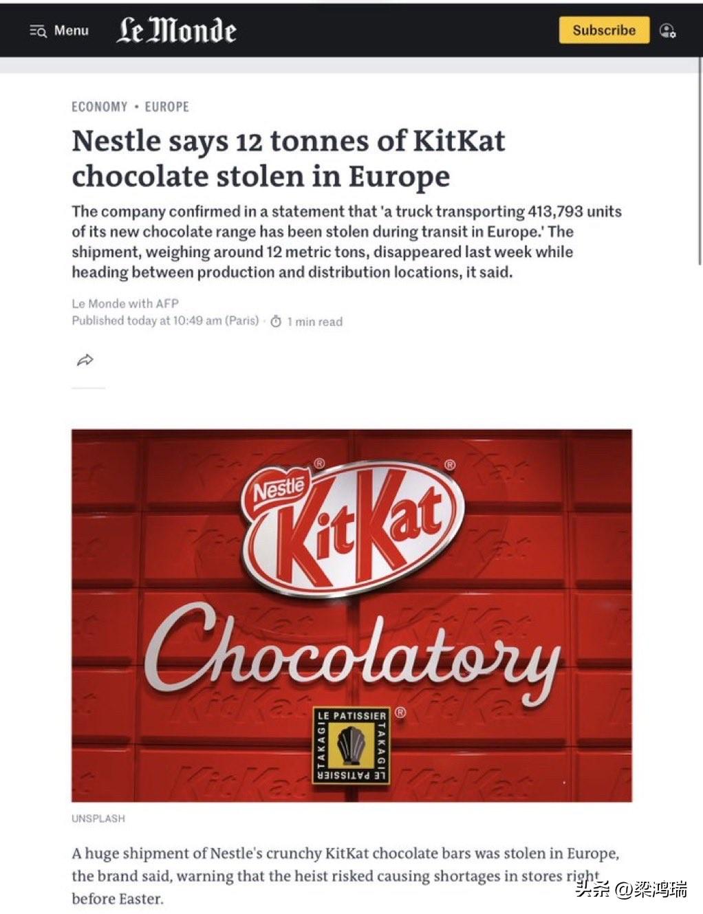 欧洲12吨KitKat巧克力被盗——整辆卡车不翼而飞。 窃贼劫持了一辆载有超过41.3万条奇巧巧克力的卡车。这辆卡车从意大利开往波兰,途中失踪。 事件发生在上周,但直到现在才被曝光。货物仍然下落不明。 雀巢公司警告称,这种巧克力可能会出现在灰色市场上,商店里也可能出现短缺。 该公司开玩笑说,窃贼们把这句口号理解得太字面意思了。 “我们一直鼓励大家‘放松一下’,享用KitKat巧克力。但看来窃贼们理解得太字面意思了,他们‘放松一下’,偷走了超过12吨的KitKat巧克力,”公司发言人表示。