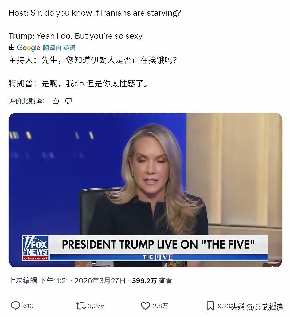 特朗普再演荒诞剧,在电视镜头公然“调情”。 特朗普接受专访,场面实在太离谱。 女主持人严肃问他,伊朗百姓有没有挨饿。 他不回答问题,反而当众说女主持人长得性感。 这种话在正式采访里说,非常不合时宜。 美国国内舆论一下子就炸了,很多人都看不下去。 他现在说话做事,越来越控制不住自己。 面对正经问题不回应,只顾着说无关的话。 完全没有一个领导人该有的样子。 主持人问的是百姓受苦的事。 他却用这种方式回避,让人特别生气。 只想着自己,不管别国老百姓的死活。 有网友说,美国很多人都觉得丢人。 作为大国领导人,公开场合不分场合。 说话随意,做事没有分寸。 笔者认为,这样的表现,只会让大家更失望。 连自己国家的人都觉得不体面。 更别说在国际上,留下的印象有多差。 对此,你怎么看呢?