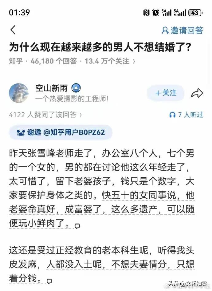 张雪峰突然离世,男女的反应竟然如此不同? “男的想的是太可惜了,这么年轻就走了,留下老婆孩子,钱只是个数字,大家互相劝慰保重身体。 而很多女性想的竟然是∶他老婆命真好,成富婆了。” 你还别说,像上文提及的女同事那种想法的女性,在当今真不是少数,要不然也不会有小红书和抖音评论区那些“接接接”了。 所以,男性在面对这种女性群体时,真的感到不值,甚至有点恐惧。张雪峰猝死 张雪峰死因 张雪峰离逝