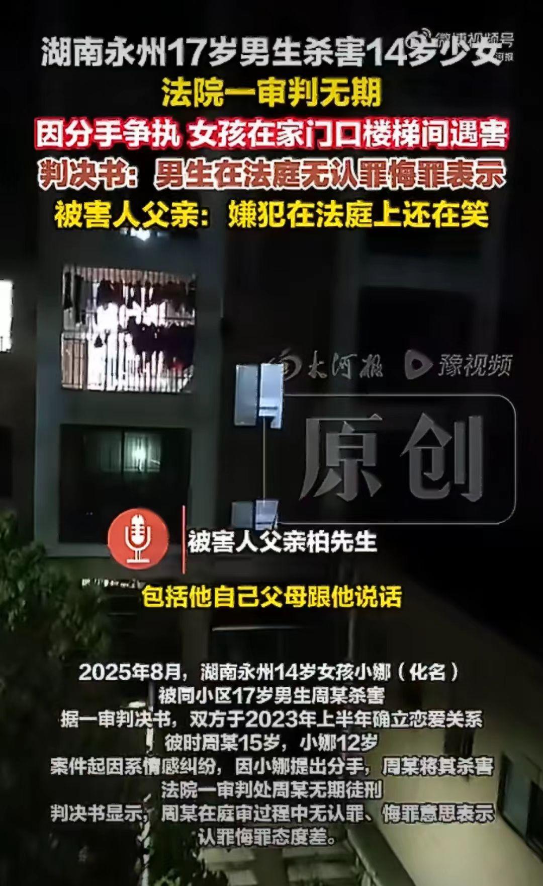 湖南小娜和男友提分手,男友剪刀捅刺女友颈部、肩部、腰部,直到剪刀握把断了,就用折叠刀在女友脖子上切割。 法院判赔偿49831.5元,无期徒刑。 判刑后,凶手毫无悔改之心,甚至在法庭上还在笑。 事情经过:2025年8月20日,小娜提出分手,周某不同意,之后,周某提出复合,小娜拒绝了,周某心生不满,8.22日,尾随小娜在单元楼内将女友捅死。 提前携带剪刀、折叠刀蹲守,这是明显的有预谋的谋杀吗? 在用剪刀捅杀时,剪刀因用力过猛握把直接断了,这是用了多大的力气,两人谈了两年,分手了就用吓死手吗? 剪刀断后,竟然用折叠刀在脖子上切割,直至死亡才离开。 事后,庭审时,全程沉默并且面露微笑。 太可怕了,这让人还敢谈恋爱吗?难道不合适就不能分手了。 因作案时,未满18岁,依法不适用死刑。 法院判:周某无期徒刑,赔偿丧葬费4.9万元,驳回附带民事诉讼原告人的其他诉讼部分请求。 不能理解,毫无悔意,一条命只赔偿了4.9万元。 你觉得这场有预谋的谋杀赔偿4.9万元合理吗?未成年犯罪该怎么处罚? 女朋友 湖南 冬日生活打卡季 春日生活打卡季
