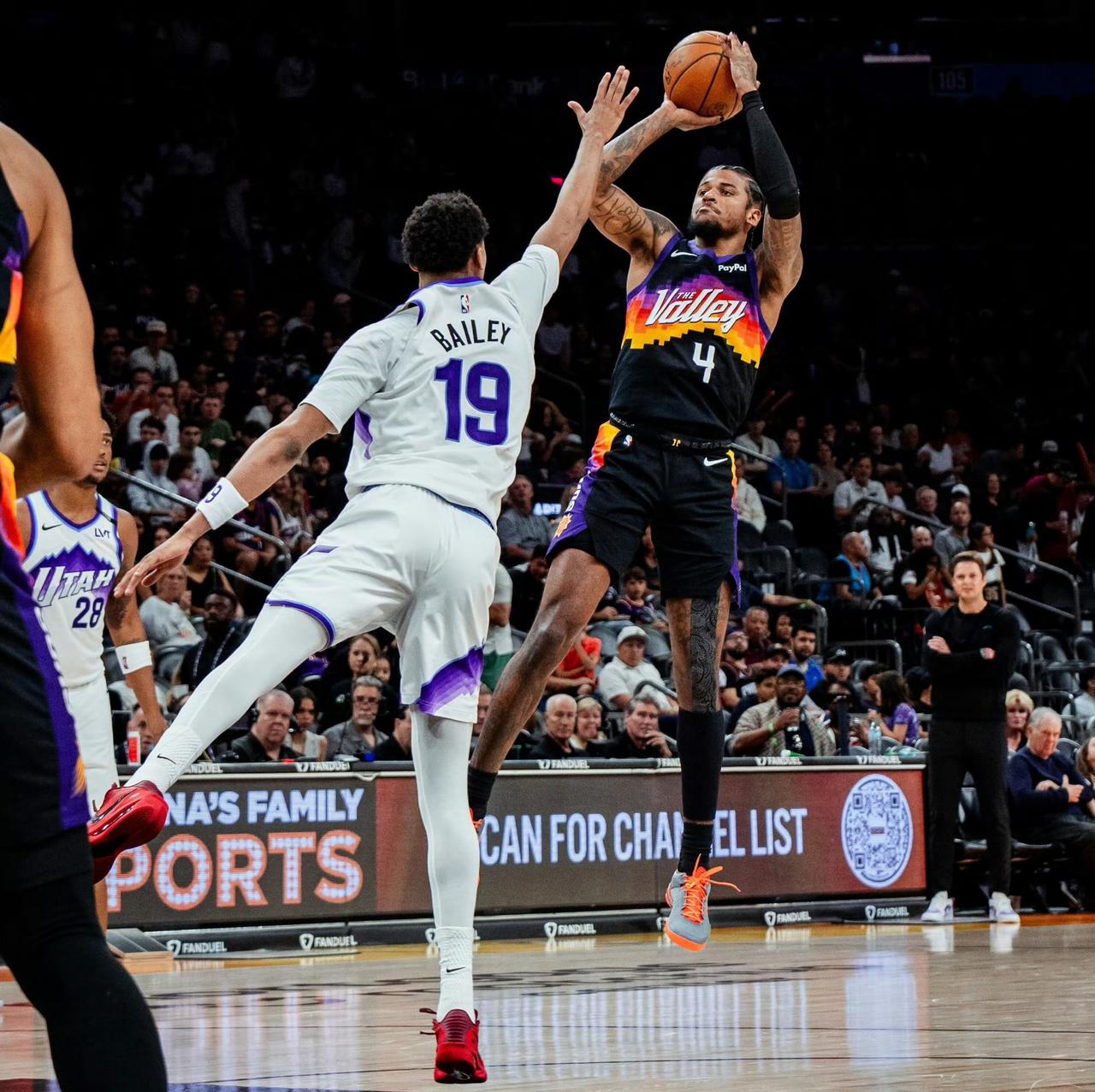 双枪联袂爆发,太阳轻取爵士 神奇小子吉莱斯皮8中10,篮筐都快砸歪了;太阳依旧半场领先28分,下半场爵士试图反扑,双枪持续火力输出配合全队传导,稳稳掌控局面最终134-109轻取爵士;对手的“弱”是一方面,主要还是双枪联袂爆发,爵士实在挡不住火力。 此役杰伦格林半场20+,全场仅出场22分钟22中13用5记三分轰出31分6篮板,只能说格林的打法与太阳的快速转换进攻不谋而合;布克则14中8交出26分8助攻。伊戈达罗成了“奇兵”,6中6弹无虚发拿到13分8篮板。 本场双枪连线尽显威力,布克组织与攻坚兼备,格林外线投射与突破犀利,太阳后场火力在线,稳住西部第七为后续赛程注入强劲信心。