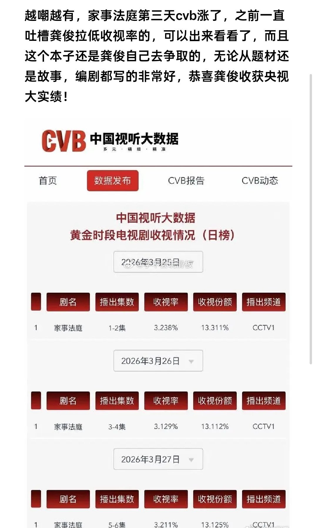 龚俊《家事法庭》第三日cvb涨了,连续三日cvb收视率破3,据说还是龚俊自己去争取的,选本眼光真不错,央视实绩稳稳拿下。