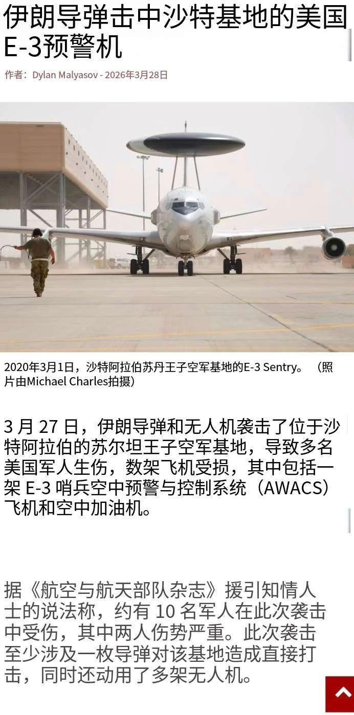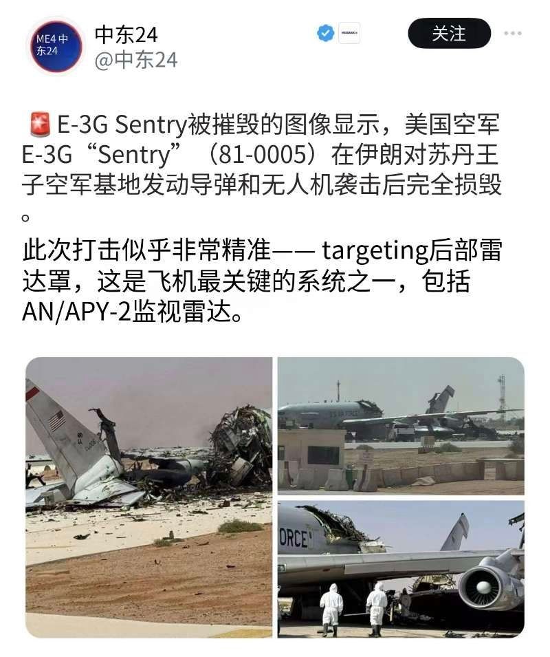 美伊以冲突 【伊朗摧毁美军战略级军机】3月27日,美国空军部署在沙特苏丹王子空军基地E-3 哨兵(AWACS)预警机被伊朗导弹和无人机突袭后摧毁,尾号81-0005。