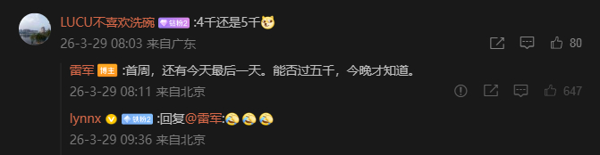 在评论区互动中,有网友追问“4千还是5千”,雷军回复称:“首周,还有今天最后一天。能否过五千,今晚才知道。”