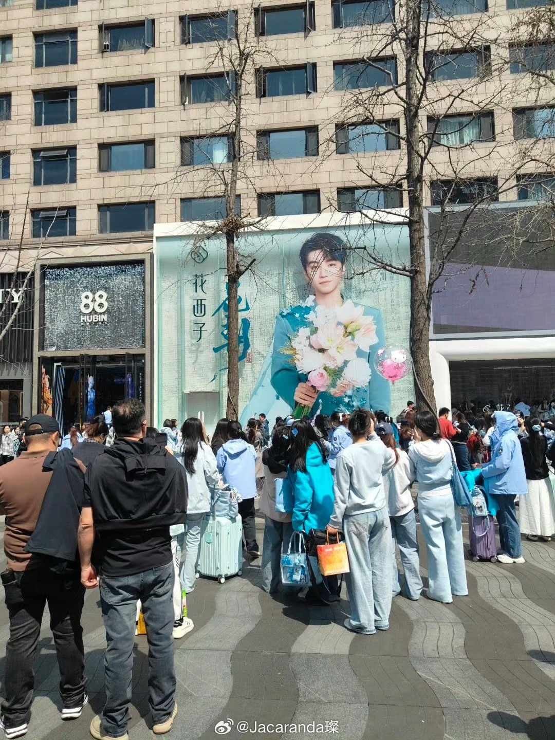 外国人不懂但加入王俊凯粉丝 由于昨天杭州王俊凯粉丝打卡人太多,外国人以为是流行的景点也打卡拍照起来了还用了小螃蟹的渐变蓝行李箱摆拍,哈哈哈外国人不懂,但人这么多一定得加入王俊凯回应拿错奖杯了