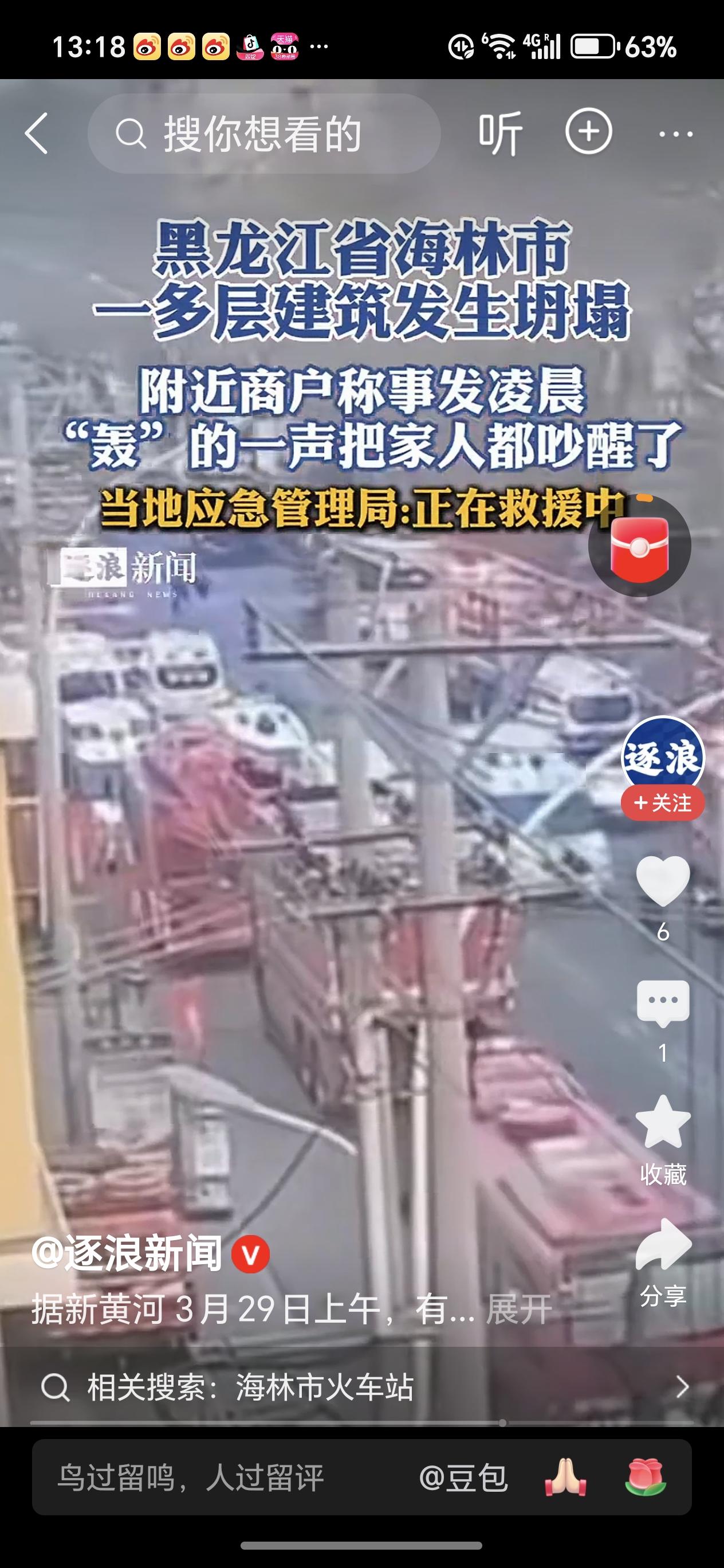 黑龙江海林一楼房坍塌9人被困3月29日凌晨,黑龙江海林一多层建筑发生部分坍塌,该建筑内有火锅店和歌厅应该正在营业,有9人被困,目前救援还在紧张进行中,愿早点救出被困人员,被困者平安无事!