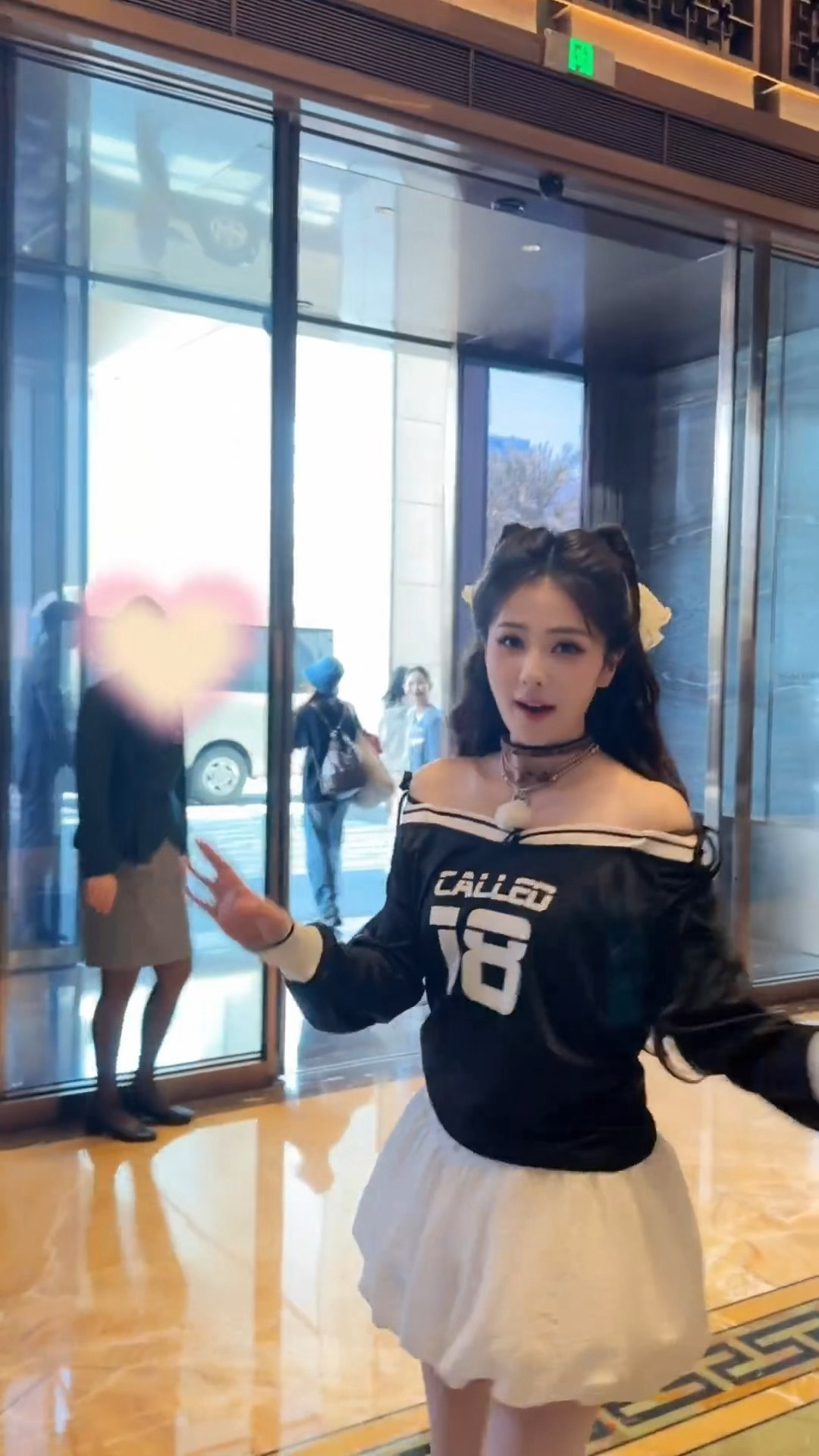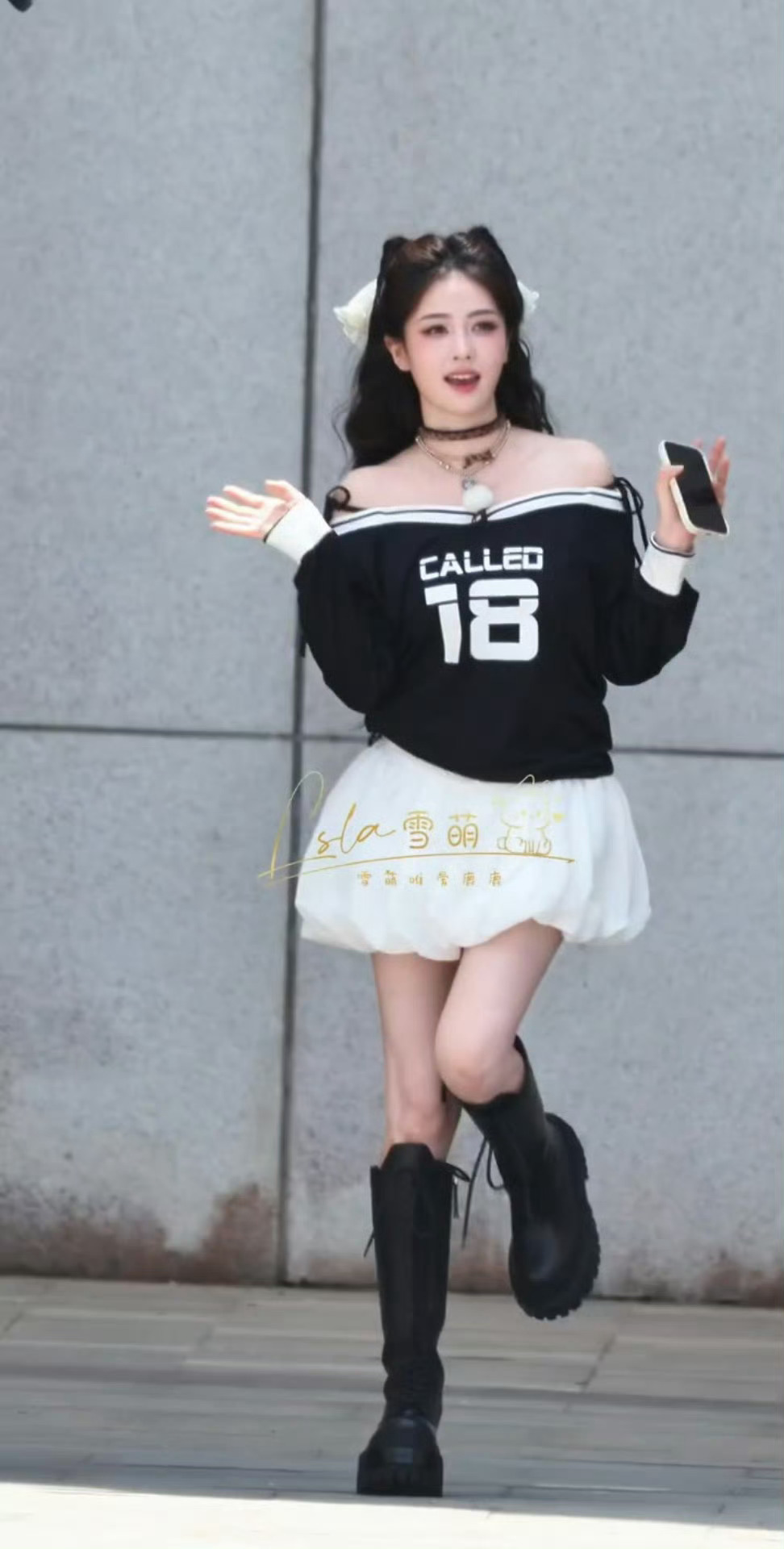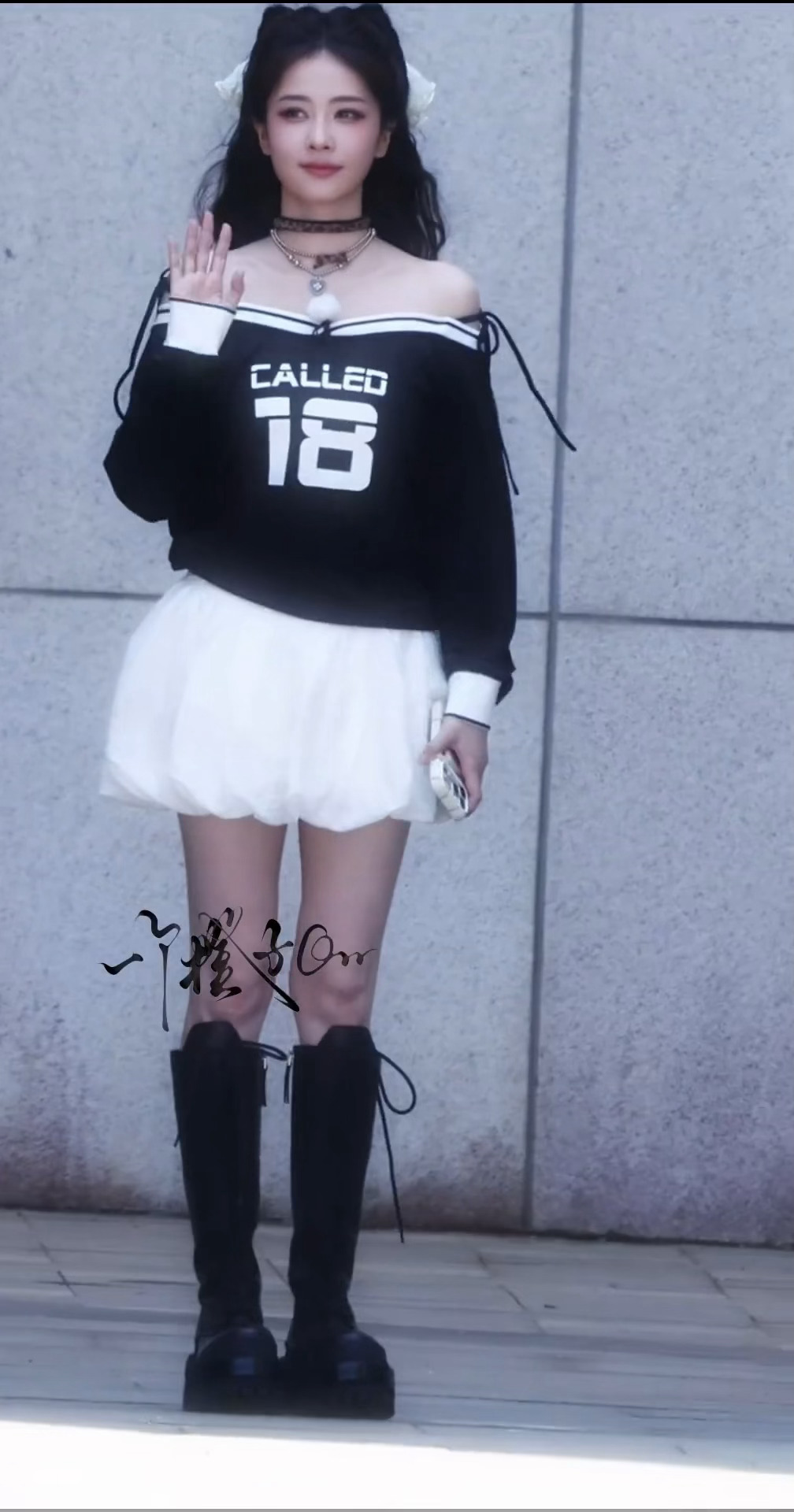 白鹿蝴蝶结猫猫头造型白鹿露肩纱裙路透