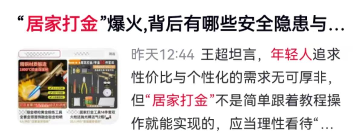 最近社交平台上涌动着一股颇为硬核的风潮,不少年轻人不再光顾橱窗明亮的珠宝店,转身买起喷枪、坩埚和锤子,开始在自家餐桌上“居家打金”。黄金这种曾经和财富保值深度绑定的贵金属,正以极为接地气的手工形态,成为新一代的案头玩物。这股热潮的兴起有着非常清晰的现实推手,当下品牌金店的加工费水涨船高,动辄几十元甚至上百元一克的工费让很多人望而却步。拿着家里款式过时的老旧首饰去翻新,不如自己买点原料和工具动手来得划算。 翻开历史的画卷,打金这门手艺远比想象中厚重。它并非凭空出现的网红产物,早在春秋战国时期就已初现端倪,明清时期经由潮州传入雷州半岛,逐渐聚拢起庞大的匠人群体。传统的打金师傅手里攥着榔头、锉刀,靠着一口气吹筒焊接、一根丝拉丝、一刀一刻花,在师徒传承的体系下摸爬滚打多年,才敢接下定制戒指、项圈的活计。如今这门古老技艺跨越时空,直接落在了当代年轻人的阳台和工作台上。这背后折射出消费观念的实质性转移,从过去非大牌不买,转向了极度看重性价比与自我表达的个性化需求。 亲手把金块熔化成液体,再一点点塑形打磨,这种从无到有的掌控感确实让人上头。甚至因为二次元文化的渗透,还催生了结合动漫元素的“痛金”定制。这种传统技艺与现代金属工艺融合的模式,让打金从单纯的加工手段,演变成了一种极具传播力的现代生活方式。央广网等权威媒体近期也敏锐捕捉到了这一现象。面对这股DIY风潮,业内人士王超坦言了其中的冷思考。年轻人追求新鲜感和性价比完全合情合理,把“居家打金”想得过于简单却极其危险。 隔行如隔山这句话在打金这件事上体现得淋漓尽致。老手艺人的那套工具,在现代家居环境里其实暗藏重重隐患。高温喷枪熔化黄金,操作稍有不慎极易引发火灾或严重烫伤。打磨抛光环节产生的细微金属粉尘,如果在密闭的室内空间达到一定浓度,哪怕是一点微小的静电火花,都可能引发粉尘爆炸。安全层面的风险只是其一,真正的隐形成本往往在财产损失上。黄金在反复加热锤打的过程中,必然会产生物理损耗。没有专业经验的普通人操作,氧化烧损的比例极难控制。看似省下了几百块钱的加工费,最后秤上一称,可能损耗掉的克重早就远远超过了这笔钱。 看待“居家打金”这股热潮,需要一份理性的冷度。它确实打破了传统首饰店的刻板模式,赋予了黄金更多的情绪价值和社交属性,让老旧首饰有了重获新生的低成本路径。作为一种体验式的手作活动,它的解压感和成就感毋庸置疑。但若真想靠看几个短视频教程,就把贵重金料加工成能日常佩戴的精品首饰,无异于盲人摸象。对于普通消费者而言,搞清楚手工的边界在哪,或许比盲目跟风买工具更有实际意义。享受DIY乐趣的同时,把高难度的精细活交给具备资质的专业师傅,才是对待黄金这种硬通货最稳妥的态度。 以上内容仅供参考和借鉴