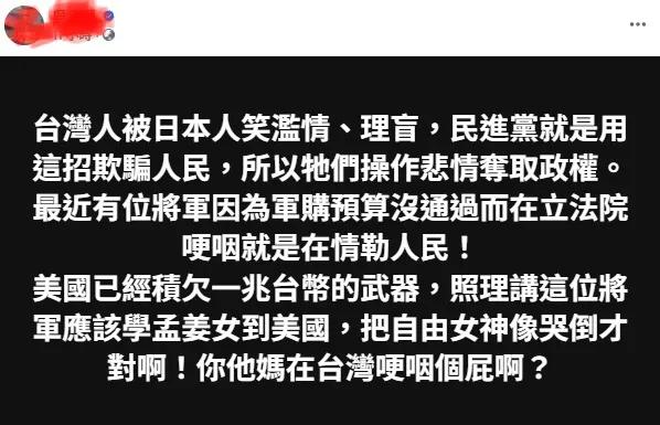 因为民进党炮制的1.2兆新台币防务预算在民意机构没通过,台湾防卫部门“战规司”司长黄中启中将泪洒院会,哽咽之情令人难以观看。 一位正直的台湾网友提出建议说:台湾人被日本人笑滥情、理盲,民进党就是用这招欺骗人民,所以他们操作悲情夺取政权。美国已经积欠一兆台币的武器,照理讲这位将军应该学孟姜女到美国,把自由女神像哭倒才对啊!你他妈在台湾哽咽个屁啊? 这个建议不错,我也提出一个建议,黄中启改名“黄姜女”,然后赖清德派他立即马上到美国对着“特朗普大帝”去哭,直到哭到美国把欠下的武器全部送到台湾为止,否则不准返台。