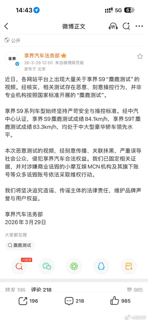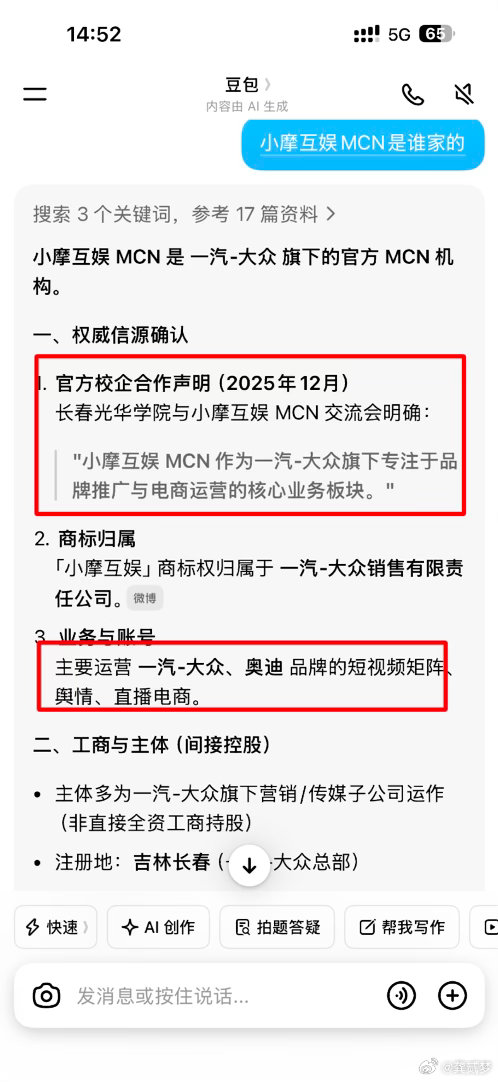 看到享界法务发文了吧这个涉及商业诋毁的“小摩互娱MCN”我问了下ai得到的回答是图二“主要运营 一汽-大众、奥迪 品牌的短视频矩阵、舆情、直播电商。”再看看哥们图三发的微博,看来我信源一直很稳大v聊车