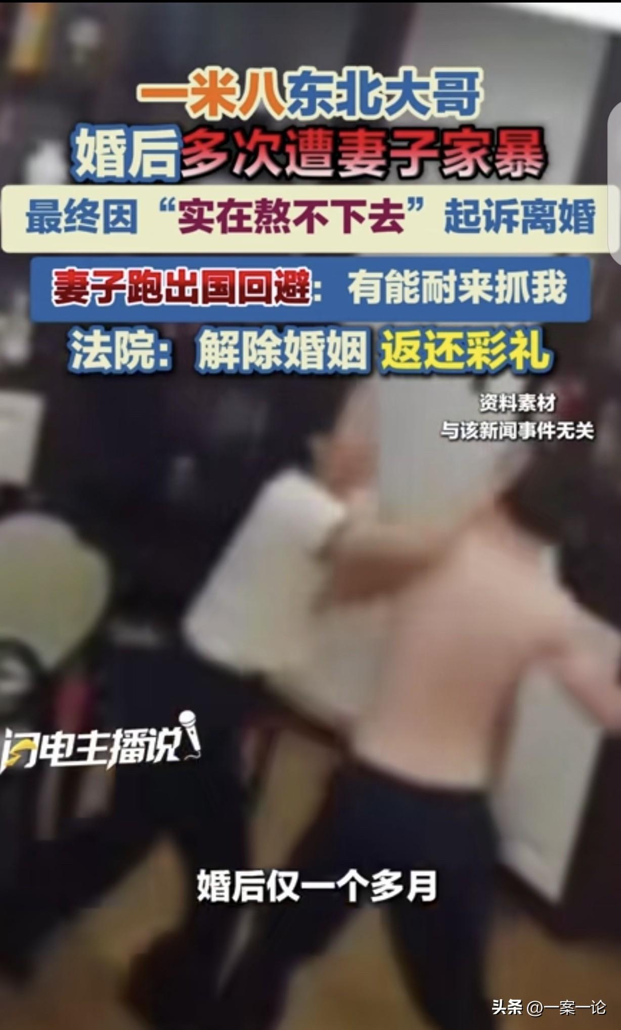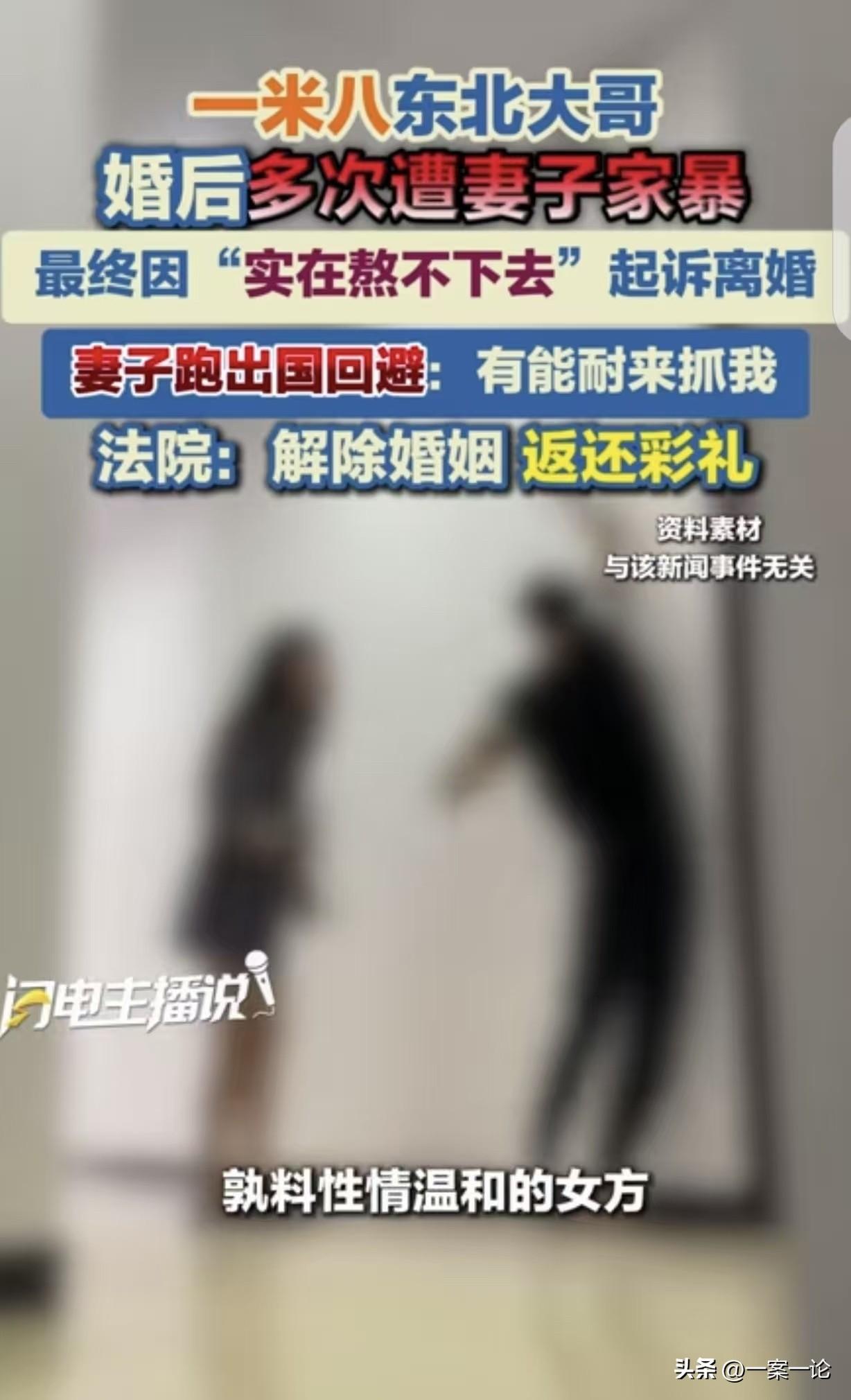 “真给男人丢脸!”吉林榆树,一1.85米男子,认识妻子6个月结婚,可妻子婚后小鸟依人1个月,竟河东狮吼,多次把男子打的皮开肉绽,男子吓得瑟瑟发抖,实在受不了了起诉离婚,妻子不同意,跑到国外逃避离婚,还对法官嚣张的说:有能耐来抓我! 1米85大个的齐先生怎么也没想到,自己竟然会栽在一个“弱女子”手里。 当初,齐先生到了谈婚论嫁的年纪,他认识了王女士,看她温婉贤惠、小鸟依人,很符合他心里妻子的标准。 两人相处半年,就高高兴兴领了证结了婚。 谁知这段婚姻的甜蜜期短得可怜,刚满一个月,原本温柔的妻子就像变了个人,家里从此再无宁日。 王女士动不动,就因为鸡毛蒜皮的小事发火,发起火来非常暴躁,经常对齐先生非打即骂。 齐先生虽然长得人高马大,可骨子里是个性格温厚、不愿对女人动手的男人。 在他看来,打女人的男人没出息,他压根没长打女人的手。 面对妻子的撒泼和拳脚,他总是选择忍让。可这种退让并没换来安宁,反而让王女士变本加厉,甚至开始用家里的器械进行威胁。 齐先生一个大男人,竟然被这种长期的打骂折磨得浑身是伤,皮开肉绽的痕迹触目惊心,心理上也留下了极大的阴影,听见大声说话都吓得打哆嗦。 实在是过不下去了,齐先生下定决心提出离婚,想从这噩梦般的日子里逃出来。 可王女士根本不配合,她既不改掉家暴的毛病,也坚决不同意分开。 为了躲避离婚程序的推进,王女士竟然直接买了机票躲到国外,切断了所有正常的沟通。 在她看来,只要自己不出面,这婚就离不成,甚至在法官尝试联系她进行调解时,她态度极其嚣张,不仅在电话里辱骂工作人员,还隔着大洋放狠话,觉得国内的法律拿远在海外的她没办法,公然叫嚣让法官有本事去国外抓她。 面对这种僵局,齐先生没有退缩。他收集了自己受伤时的照片、多次报警留下的回执、医院的诊断证明以及邻居的证言,将厚厚一沓证据交到了法院。 法官通过多种方式与王女士取得了联系,虽然过程异常艰难,对方的情绪也反复无常,但法律并不会因为谁躲得远就失去效力。 法院在查明家暴事实,而且双方感情确已破裂的情况下,经过反复沟通和严正告知,最终做出了公正的裁决:同意齐先生离婚,王女士返还彩礼。 齐先生不仅拿到了离婚判决书,法官还考虑到,婚姻存续时间极短,以及女方的过错行为,判定王女士必须返还相应的彩礼。 这个案子在当地传开后,不少人说齐先生白长了那么大个子,甚至有人笑话他给男人丢脸。 但理智的人都明白,这绝不是丢脸的问题,而是家暴根本不分男女,暴 力本身就是不可原谅的恶行。 齐先生选择用法律武器保护自己,而非以暴制暴,这恰恰是该有的体面。 《民法典》第1079条规定,法院审理离婚案件时,若感情确已破裂且调解无效,应当准予离婚。其中“实施家庭暴 力”是判决离婚的法定情形之一。 本案中,王女士婚后长期对齐先生实施殴打、器械威胁,导致其身心受创,齐先生提供的照片和就医证明构成了完整的证据链。 即便王女士远避海外、拒绝配合,法院仍可依法认定夫妻感情已因家暴彻底破裂,判决解除婚姻关系,并结合彩礼支付情况及过错程度判令返还。 对于这件事,你怎么看? 欢迎关注@一案一论