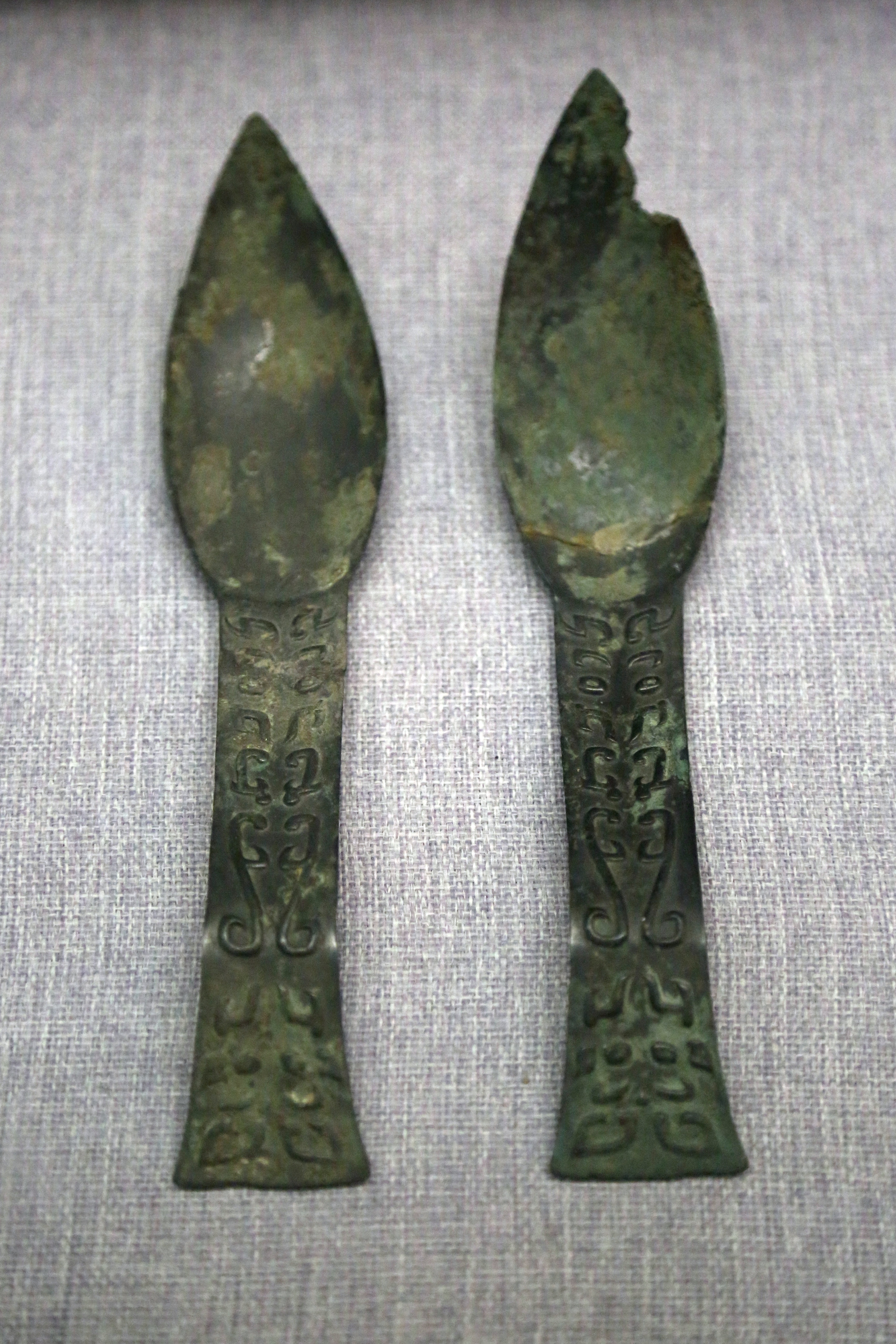 每天一件青铜器 河南洛阳市博物馆藏洛阳北窑西周墓地出图的西周早期:离散兽面纹匕, 一对. 柄上有两组兽面, 角形不同. 兽面间也是离散型的龙纹. 这些都是西周早期周人特色的风格. 而且这种匕都是水滴形的勺部, 头尖边缘薄, 感觉除了捞肉喝肉汤,也能当餐刀使用